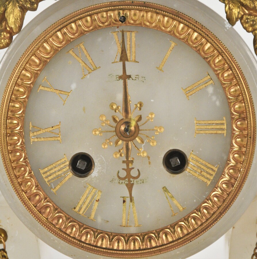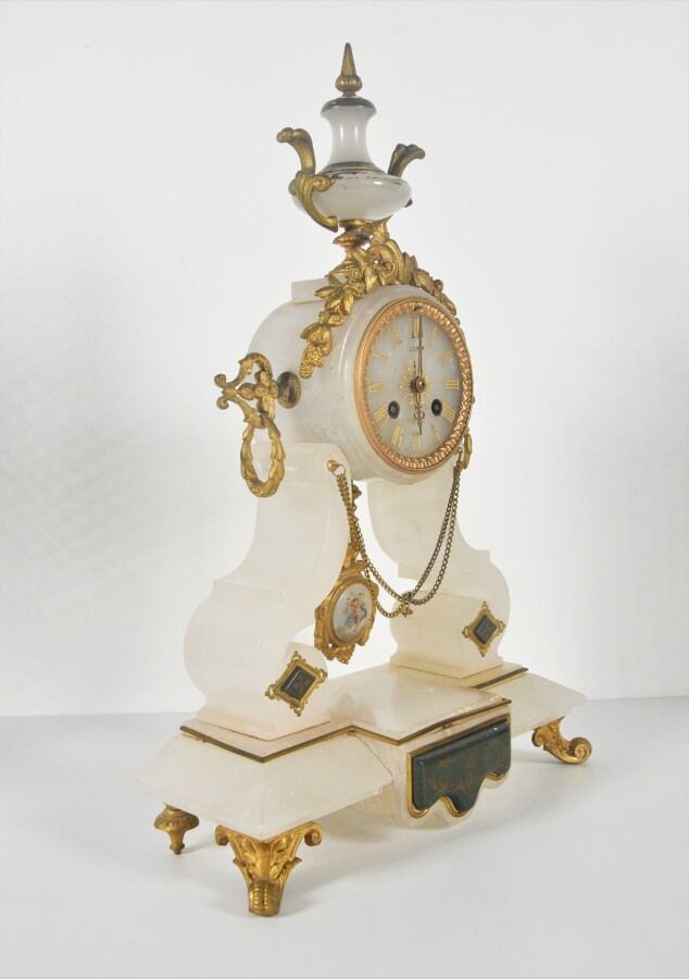 Garniture de cheminée en albâtre, cuivre repoussé et bronze doré, comprenant une pendule portique, le cadran en albâtre, le balancier retenant un cercle d'albâtre peint représentant un petit angelot, les heures en chiffre romain encadré d'une guirlande végétale et surmonté d'un vase à l'antique, décor peint en vert et reposant sur quatre pieds à enroulement, elle est accompagnée de sa paire de candélabres à trois bras de lumière, le fût figurant un vase de forme balustre, fin du 19e siècle, H. 47 cm (accidents, restaurations et manques à la peinture).