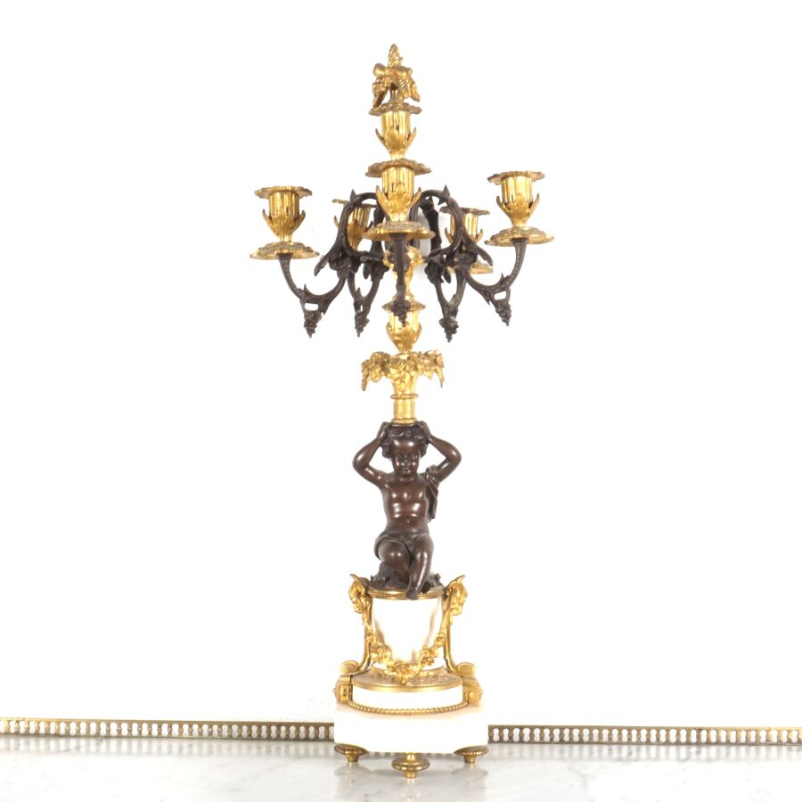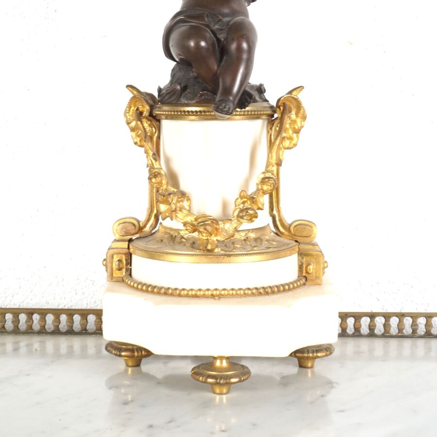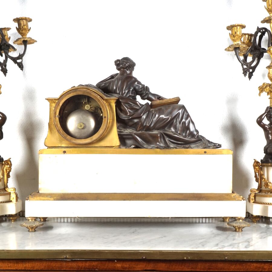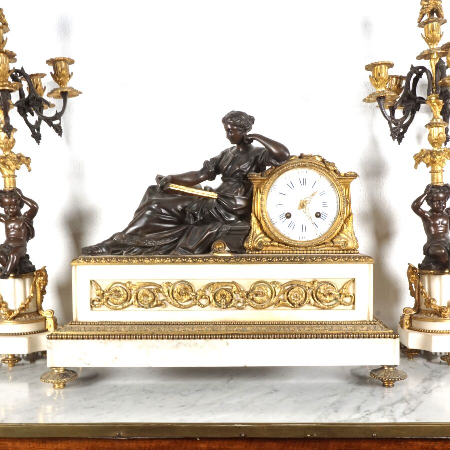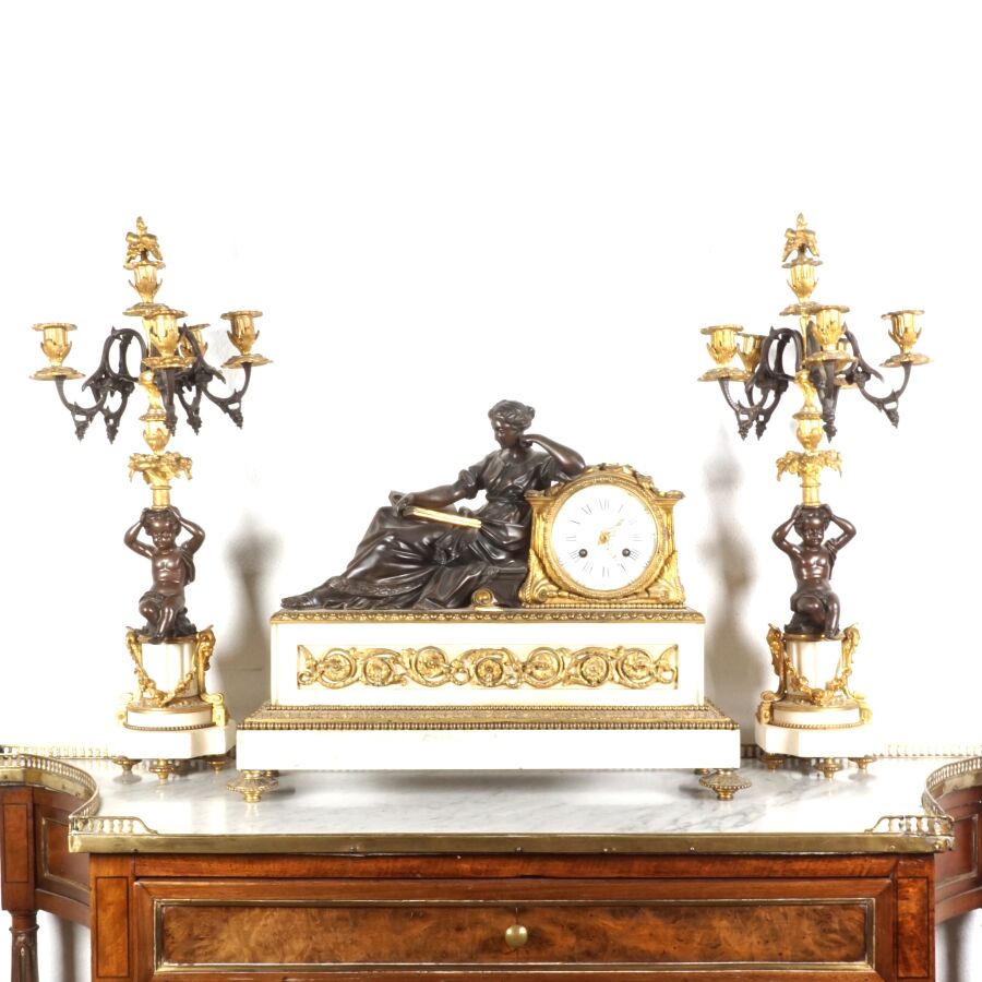 Garniture de cheminée en bronze de deux patines et marbre blanc, comprenant en pendule à poser, cadran émaillé blanc signé "Raingo frères", encadré d'un groupe en bronze figurant une femme drapée à la lecture, socle rectangulaire orné de frises en bas-relief, piétement toupie, et sa paire de candélabres à motif de putti soutenant des paniers fleuris, surmontés de six bras de lumière, 19ème siècle, Dim. Pendule : 43 x 53.2 cm. H. Candélabres : 66 cm (petites usures et égrenure, une bobèche à refixer, avec clé).