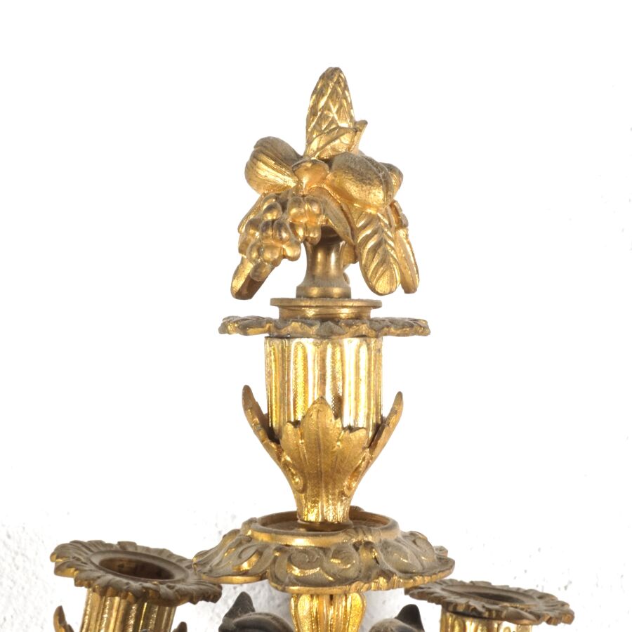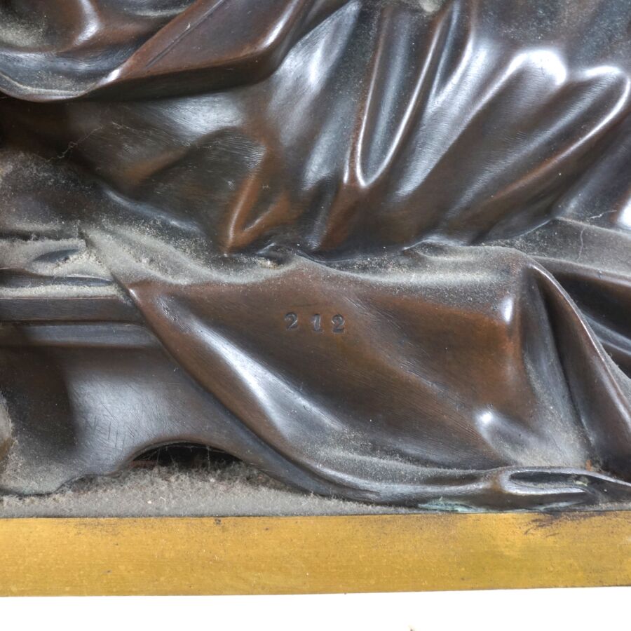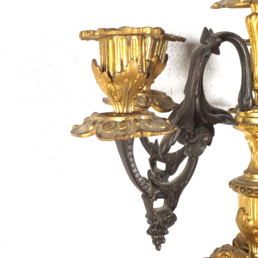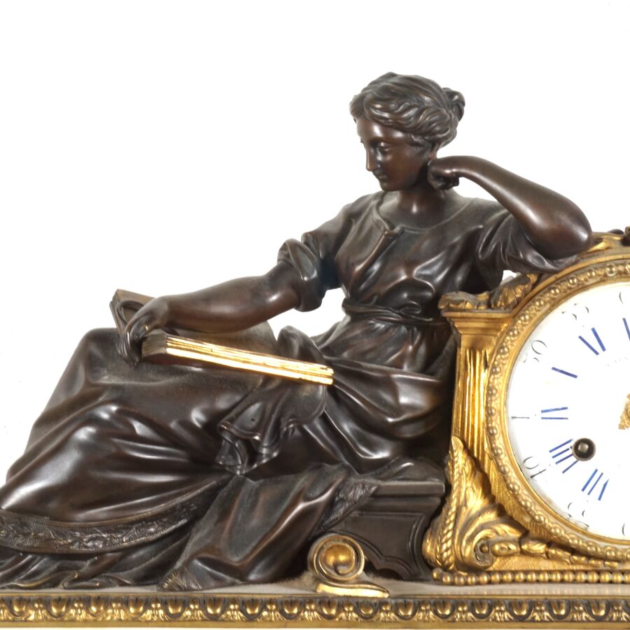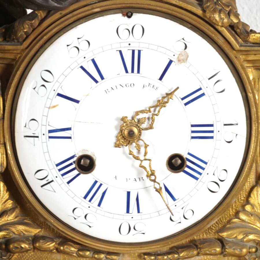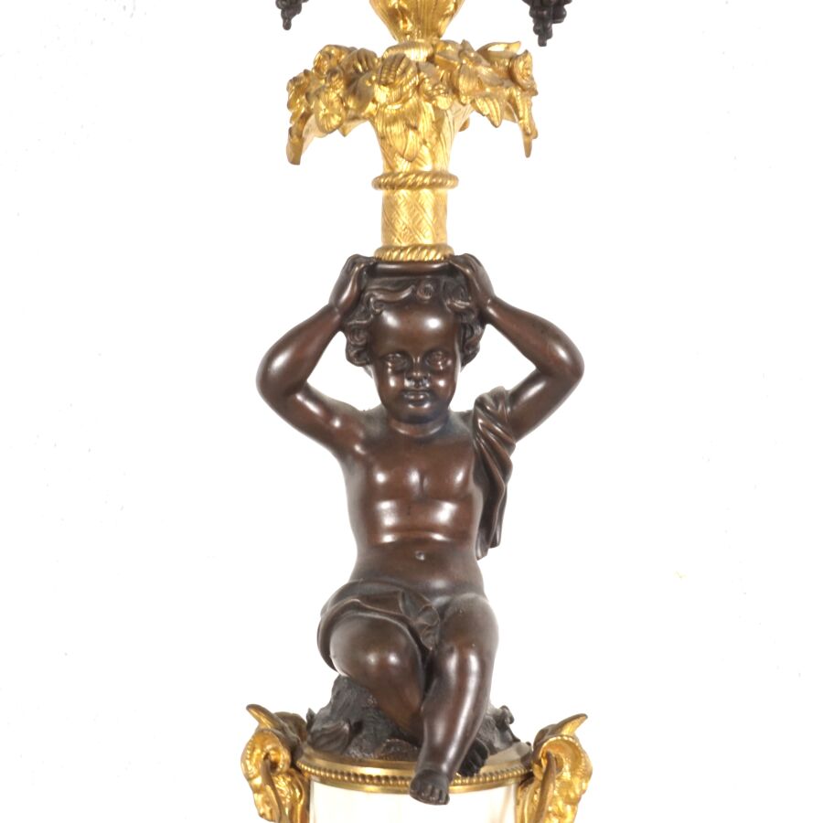 Garniture de cheminée en bronze de deux patines et marbre blanc, comprenant en pendule à poser, cadran émaillé blanc signé "Raingo frères", encadré d'un groupe en bronze figurant une femme drapée à la lecture, socle rectangulaire orné de frises en bas-relief, piétement toupie, et sa paire de candélabres à motif de putti soutenant des paniers fleuris, surmontés de six bras de lumière, 19ème siècle, Dim. Pendule : 43 x 53.2 cm. H. Candélabres : 66 cm (petites usures et égrenure, une bobèche à refixer, avec clé).