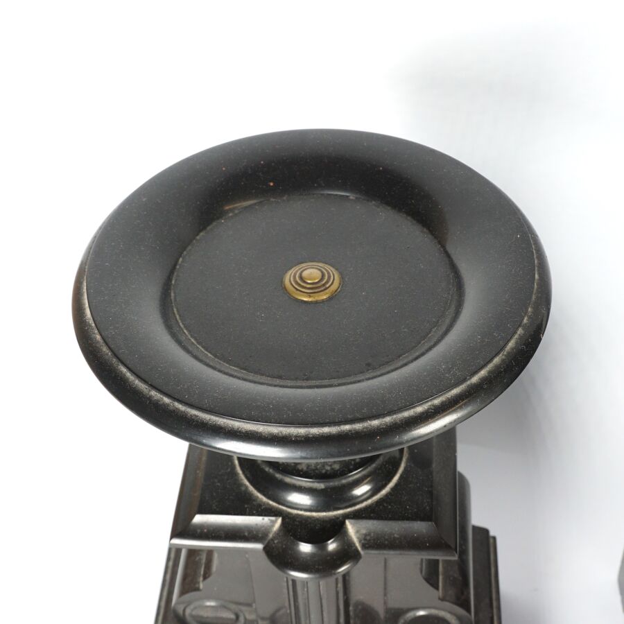 Garniture de cheminée en marbre noir comprenant une paire de cassolettes et une pendule borne, le cadran émaillé blanc, chiffres arabes pour les heures, mouvement signé CORTIAL-FAUGIER, circa 1880, H. Pendule : 48 cm (avec sa clé, éclats au cadran).
