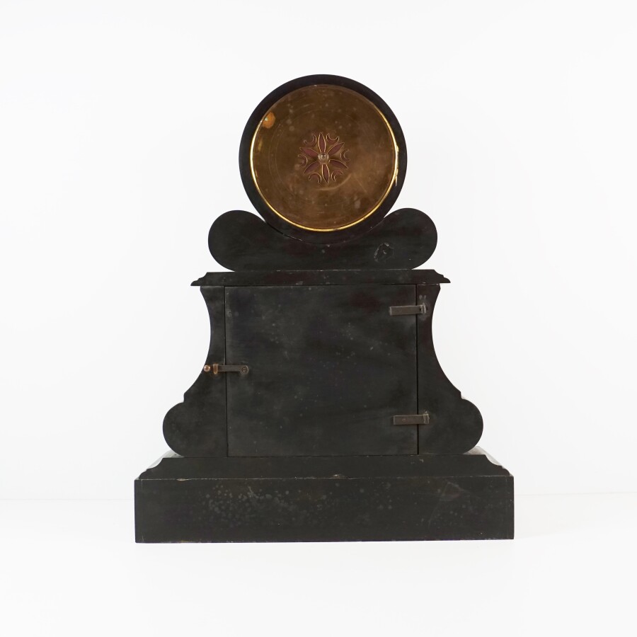 Garniture de cheminée en placage de marbre et marbre noir comprenant une pendule, cadran émaillé blanc, chiffres romains pour les heures, à décor architecturé de volutes, vitrée en partie basse laissant apparaître la balancier, et accompagnée d'une paire de cassolettes en bronze ciselé à décor végétal, reposant sur un socle en marbre, circa 1880, H. 48 cm, Lar. 40 cm (petites usures, quelques éclats).