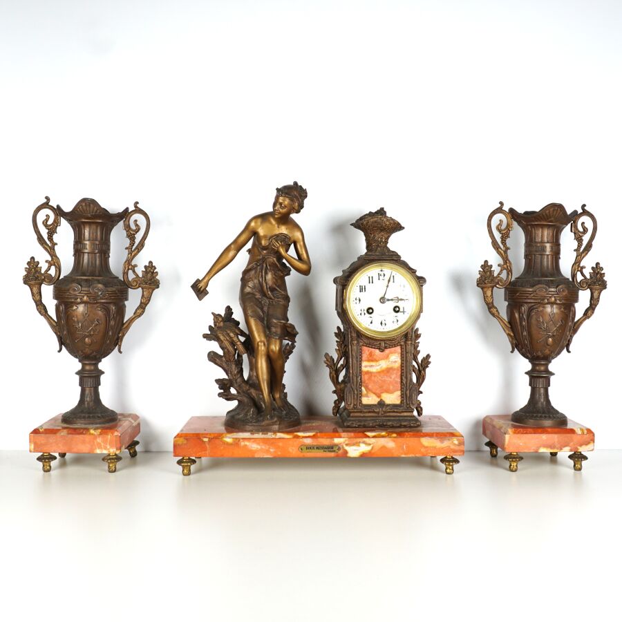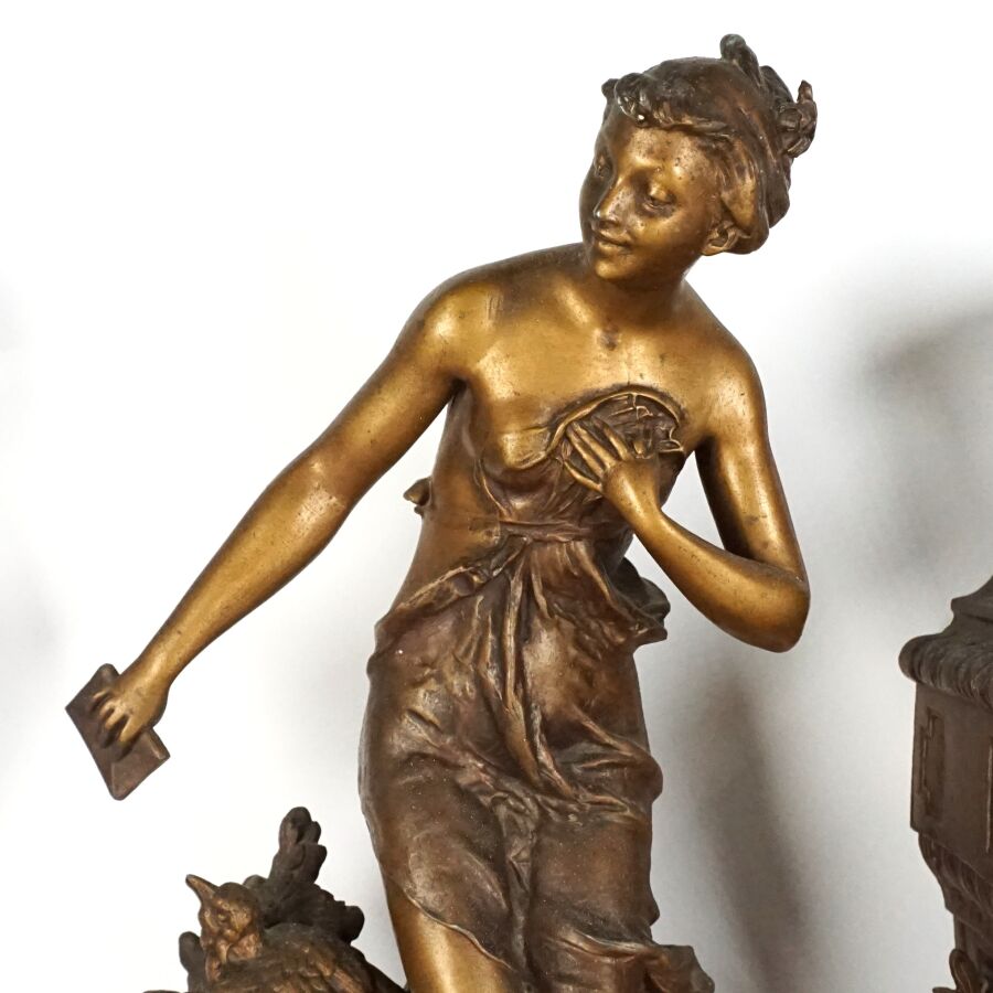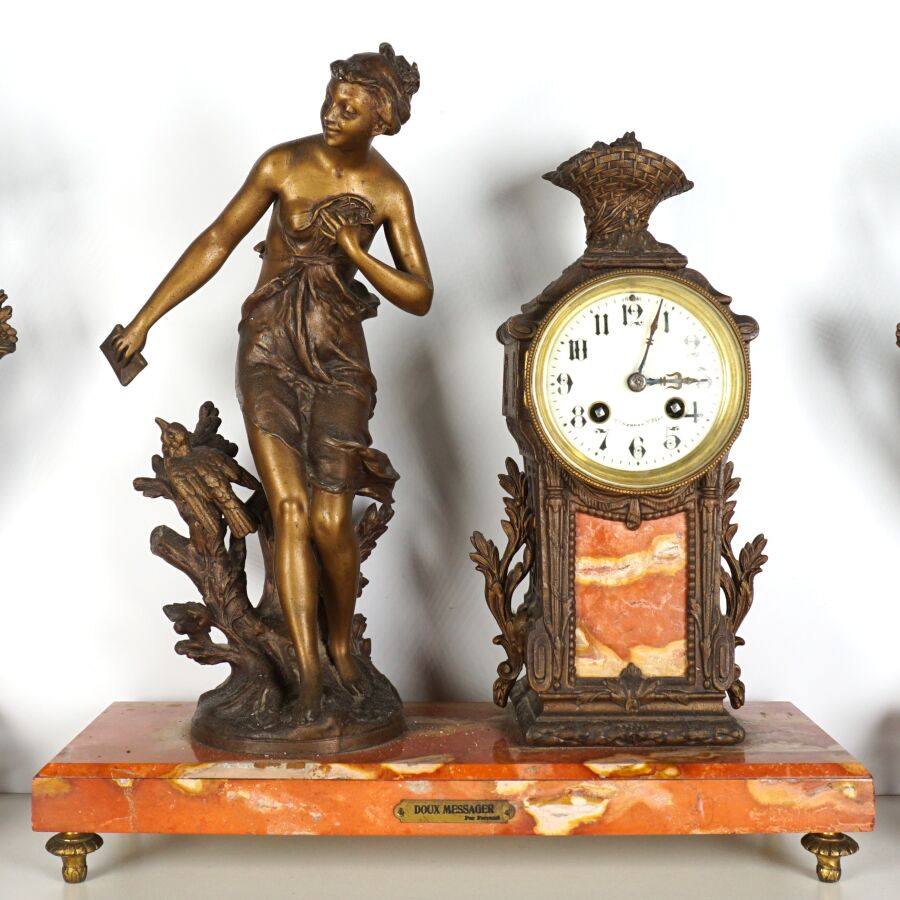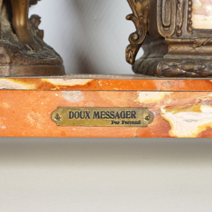 Garniture de cheminée en régule et marbre comprenant une pendule à décor d'une allégorie de la poésie portant une plaque "Doux Messager, par FERRAND", le cadran émaillé blanc signé "St Servan s/ Mer", chiffres arabes pour les heures, et une paire de vases à l'antique, Dim. Pendule : 40 x 41 x 14,5 cm. H. Vase : 38 cm (accidents).