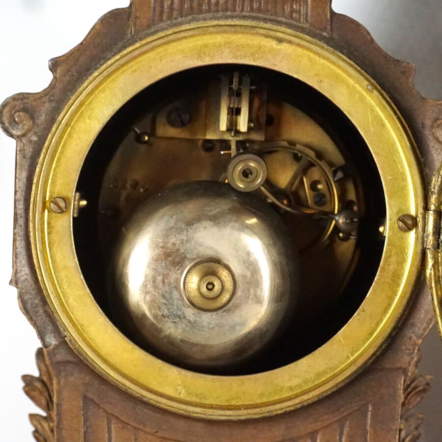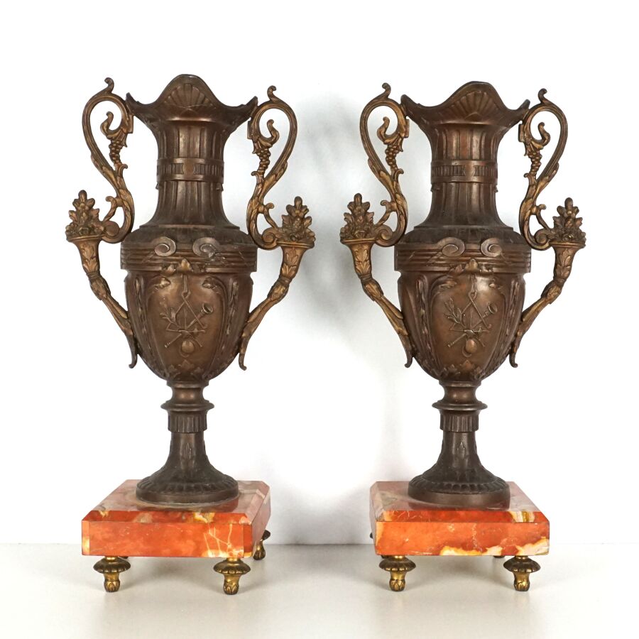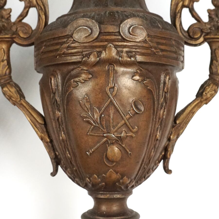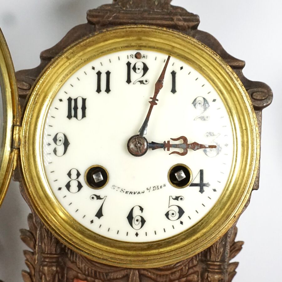 Garniture de cheminée en régule et marbre comprenant une pendule à décor d'une allégorie de la poésie portant une plaque "Doux Messager, par FERRAND", le cadran émaillé blanc signé "St Servan s/ Mer", chiffres arabes pour les heures, et une paire de vases à l'antique, Dim. Pendule : 40 x 41 x 14,5 cm. H. Vase : 38 cm (accidents).