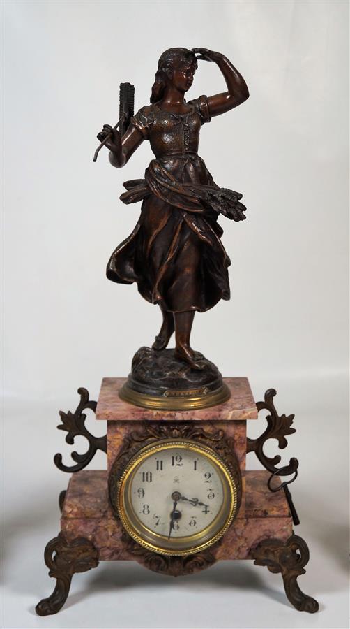 Garniture de cheminée en régule et marbre rose comprenant une pendule surmontée d'une paysanne, titrée "Faneuse", H. 55 cm et deux sujets figurant deux jeunes paysans, H. 40 cm (avec une clé, sans mécanisme, accidents et manques, un pied cassé).