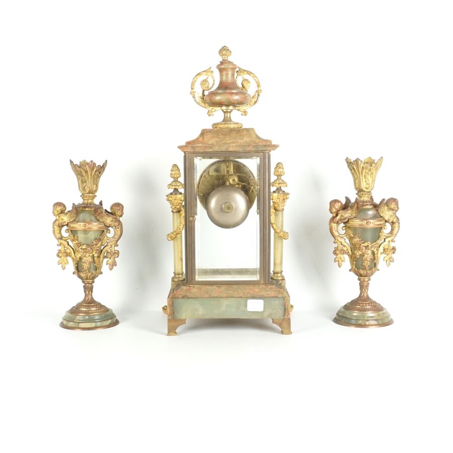 Garniture de cheminée en trois éléments, onyx et métal doré, composé d'une pendule, cadran émaillé blanc, chiffres romains pour les heures, surmonté d'une urne fleurie et encadré de colonnes, accompagnée d'une paire de vases de forme balustre, à décor d'angelots et feuillages, fin du 19ème siècle, H. 41 cm. H. Cassolettes : 24 cm (avec sa clé et son balancier, restauration au pot et usures, égrenures).