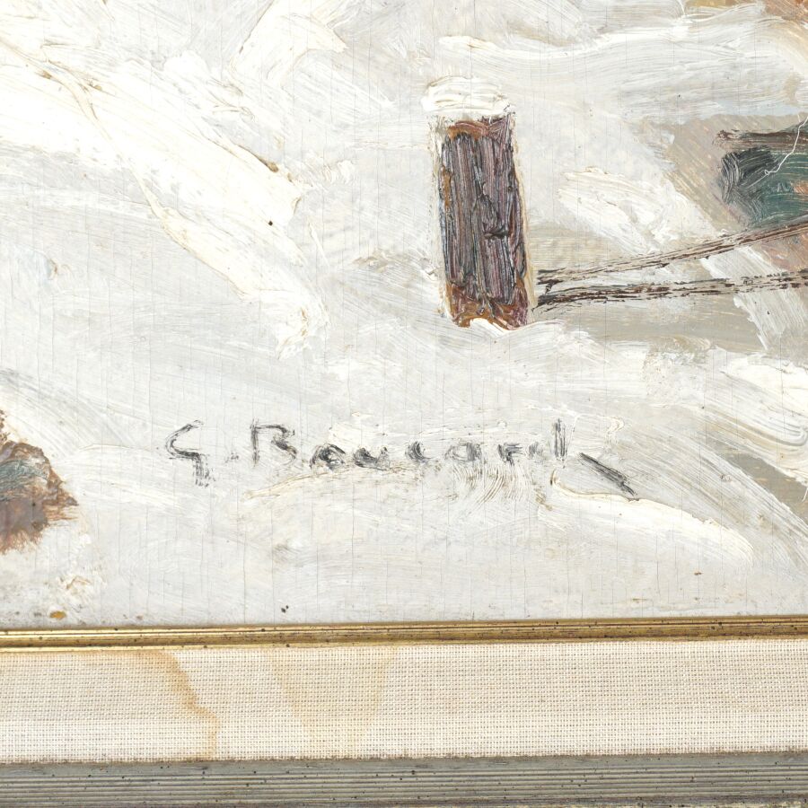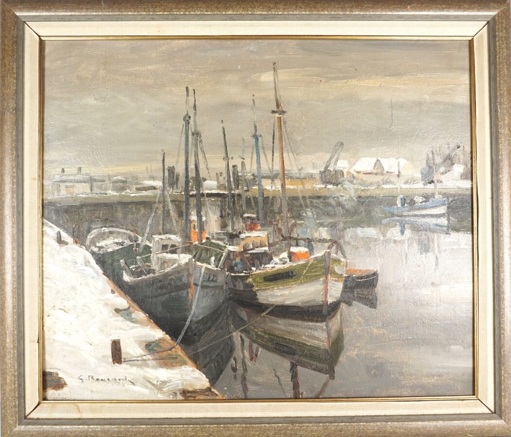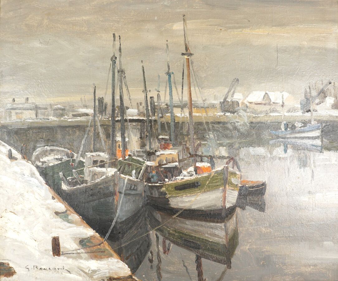 Gaston BOUCARD (1878-1962), "Port de Lorient sous la neige", huile sur panneau signée en bas à gauche, 46 x 55 cm.