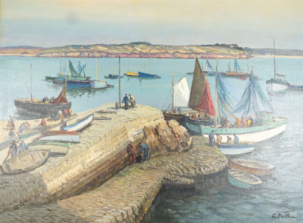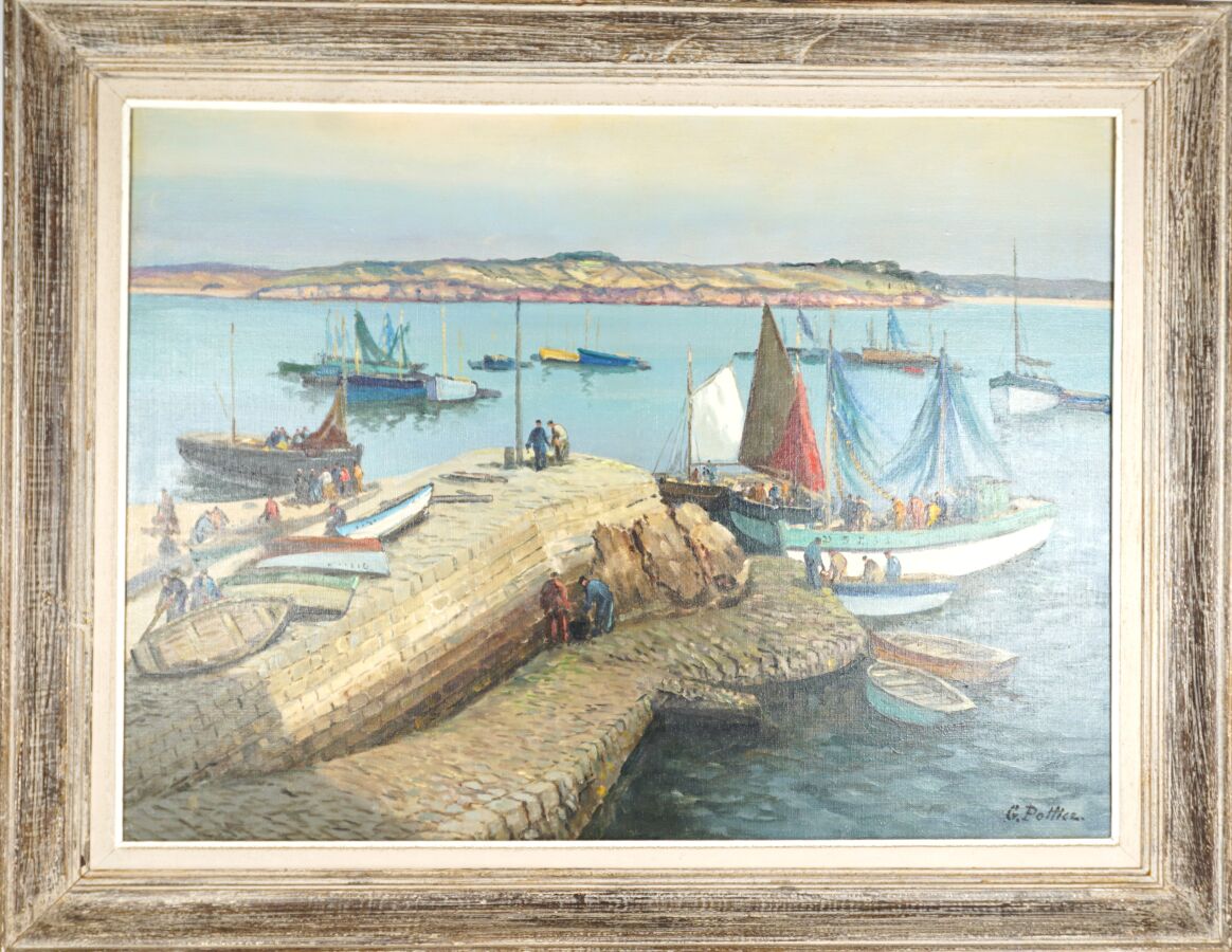 Gaston POTTIER (1885-1980), "L'arrivée des pêcheurs sur la cale du Rosbeur, Douarnenez", huile sur toile signée en bas à droite, 60 x 81 cm.
