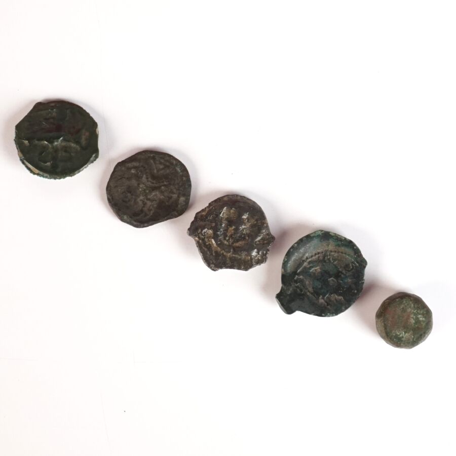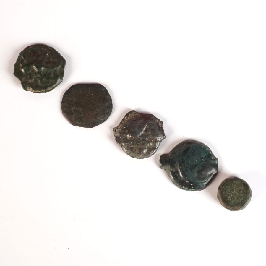 On y joint un petit poids en bronze à décor d'annelets sur la tranche, Poids brut : 4,12 g environ.