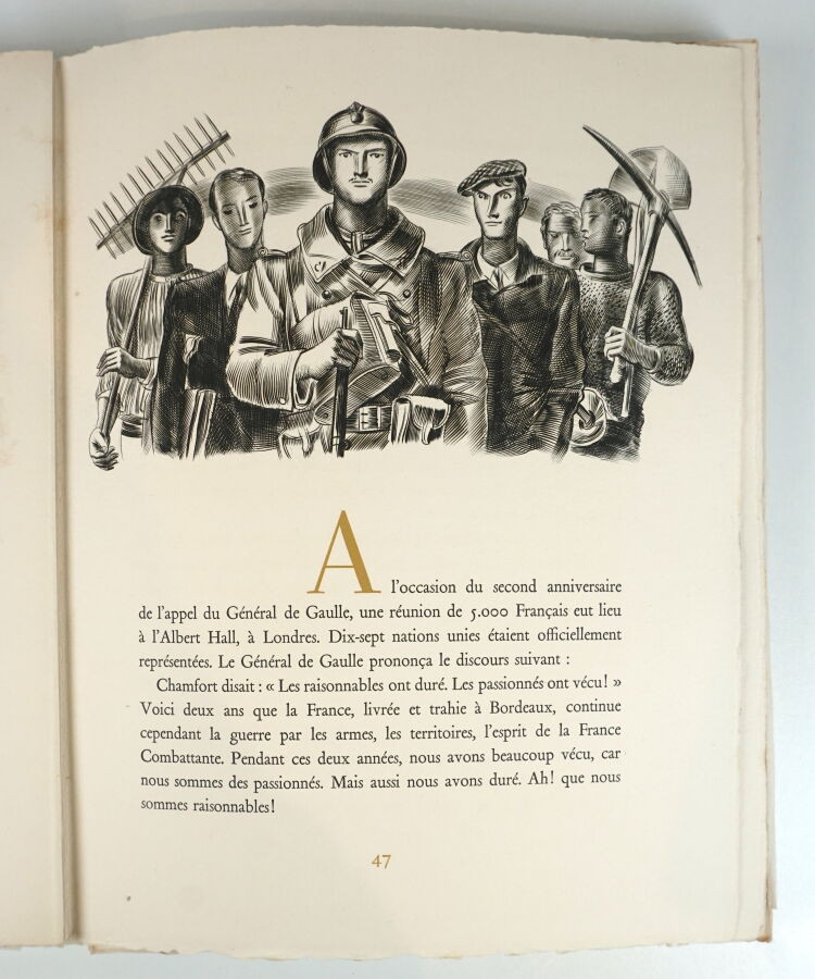 GAULLE (Charles de) - Honneur et patrie. Voici le Général de Gaulle - Paris ; Éditions G. P., 1945 - 1 volume grand In-4° en feuilles sous couverture rempliée titrée or, et emboîtage éditeur (chemise cartonnée absente) - Quelques rousseurs - Frontispice et nombreux burins en noir in texte par Decaris - 1ère édition réunissant les plus célèbres discours prononcés par de Gaulle de 1940 à 1944 - Bon exemplaire numéroté sur vélin d'Arches (n°42 sur les 30, tirage total : 350) avec 1 suite sur Chine en 1er état et 1 suite sur Japon ancien en état définitif, en feuilles sous chemise demi-toile havane.