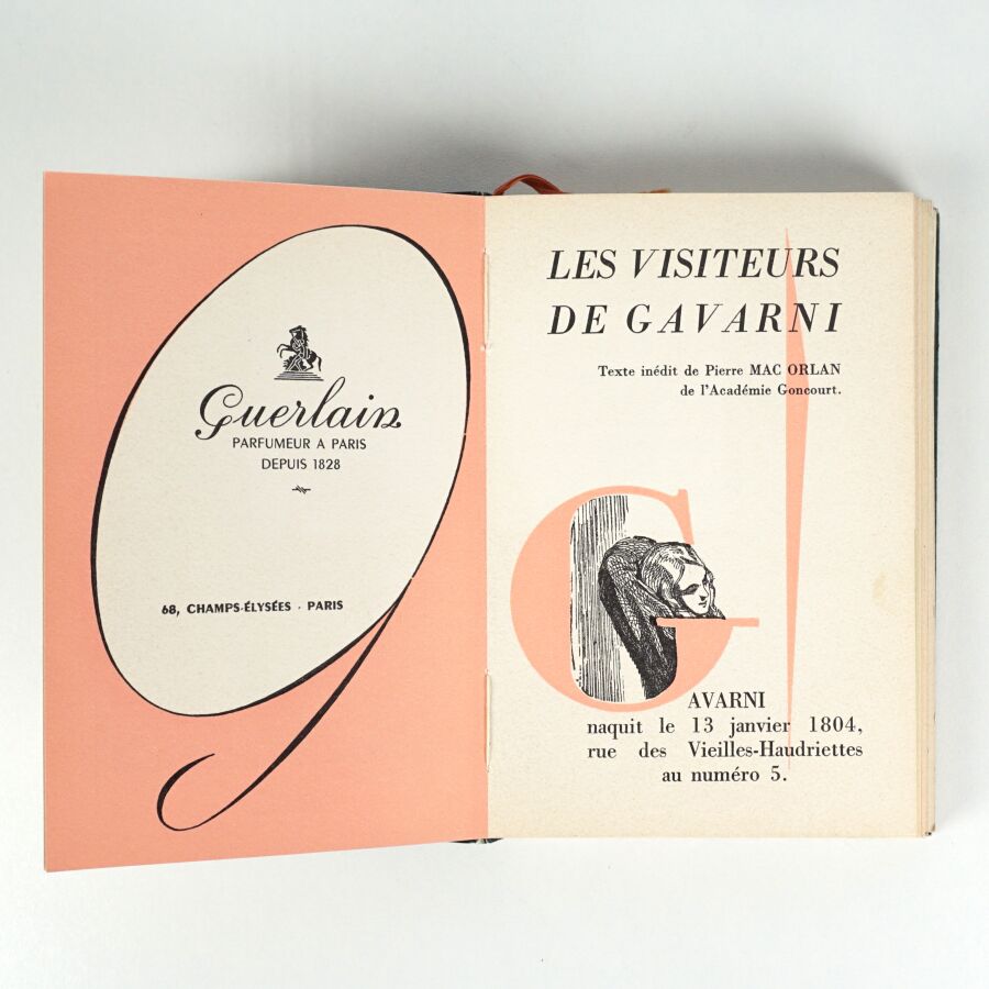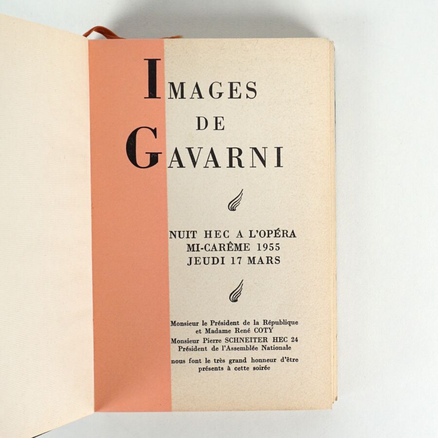 Plaquette éditée pour la nuit HEC à l'Opéra le 17 mars 1955. Elle fut tirée à 1200 exemplaires, sur papier B. F. K. de Rives. Elle est illustrée de reproductions de dessins de Gavarni et comprend un texte inédit de Pierre Mac Orlan, Les Visiteurs de Gavarni.