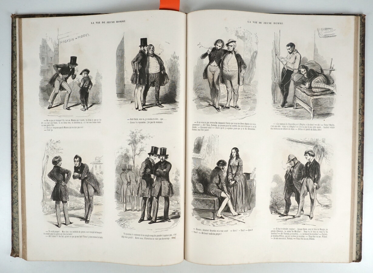 GAVARNI (Paul) - OEuvres choisies. Édition spéciale publiée par Le Figaro pour ses abonnés […] - Paris ; J. Hetzel et Blanchard, 1857 - 1 volume In-folio - 1ère garde blanche déchirée avec manque, quelques petites rousseurs et salissures éparses - 520 dessins légendés d'après Gavarni - Reliure de l'époque demi-toile havane (mors pa²rtiellement fendus, coins frottés) - Dos titré or (1 fente latérale et coiffes élimées).