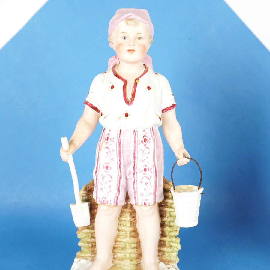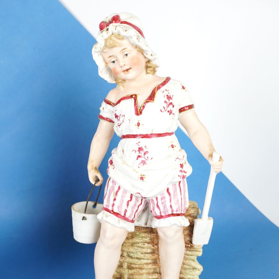 GEBRÜDER HEUBACH : Paire de sujets en biscuit à sujet de bain de mer de deux enfants, signés du cachet au dos, circa 1900, H. 28 cm.