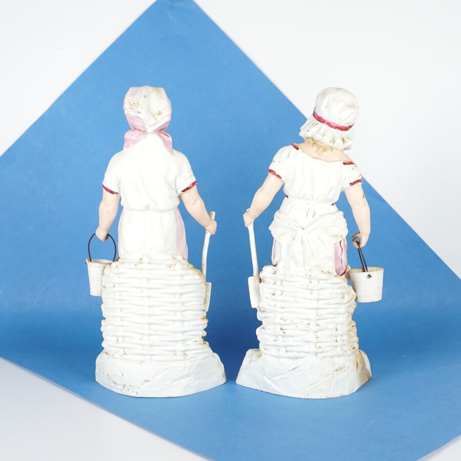 GEBRÜDER HEUBACH : Paire de sujets en biscuit à sujet de bain de mer de deux enfants, signés du cachet au dos, circa 1900, H. 28 cm.