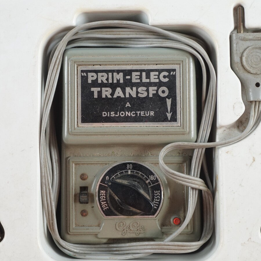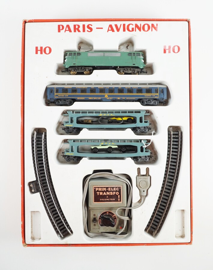 GEGE : Train "Paris-Avignon" comprenant : wagons, transformateurs et rails, circa 1960, présenté dans sa boîte d'origine, en l'état (importantes usures à la boîte).
