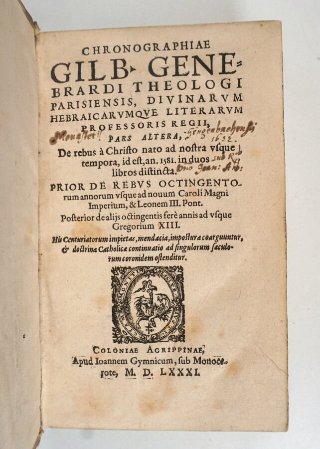 GÉNÉBRAD (Gilbert) - Chronographiae Gilb. Genebrardi Theologi Parisiensis, Divinarum hebraicarumque literarum professoris regii [] - Coloniae Agrippinae [Cologne] ; Joannem Gymmicum, 1581 - 1 volume In-8° - [16] pages puis pagination chiffrée de 473 à 1191 comprenant les livres III et IV - Quelques auréoles et rousseurs éparses - Reliure de l'époque vélin rigide richement frappé à froid (datée 1589 au 1er plat), traces de lacets, coins émoussés, 1ère charnière fendue) - Dos à nerfs orné de filets à froid, titré à l'encre noire et tomé (5) à l'encre rouge - Ex-libris manuscrit d'1 monastère au titre à l'encre noire - Bon exemplaire.
