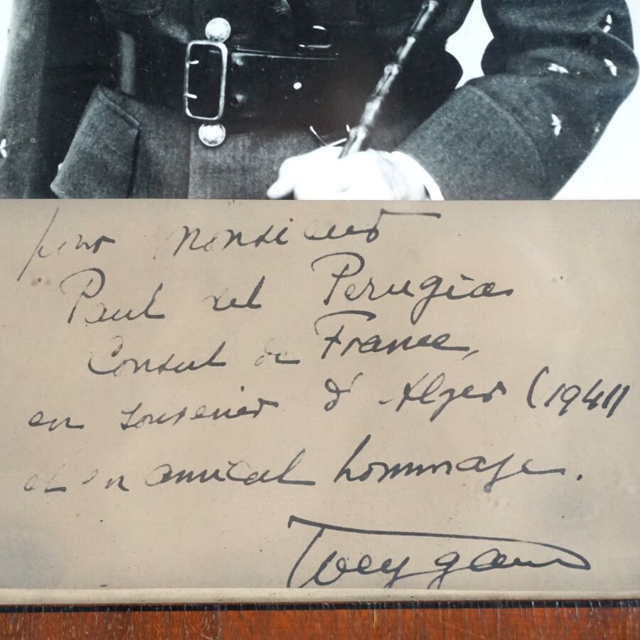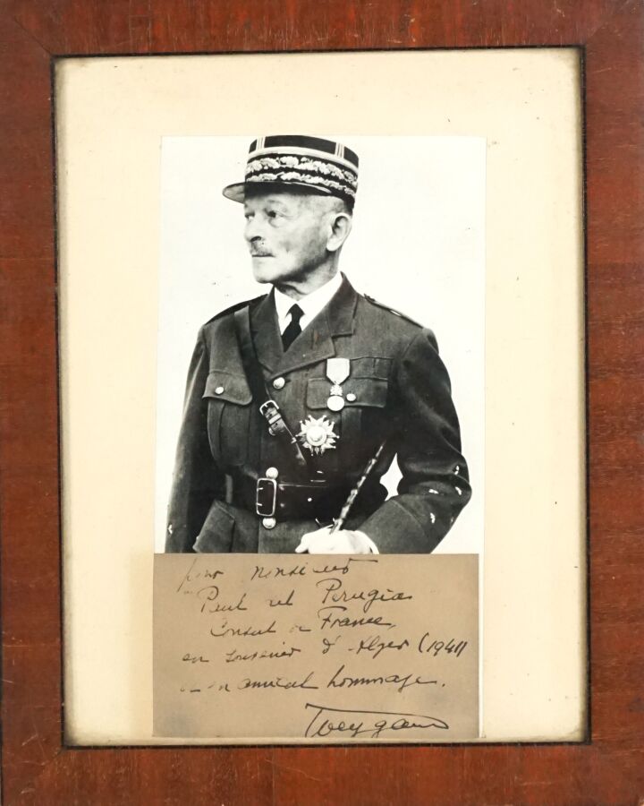 Général WEYGAND - PORTRAIT PHOTOGRAPHE, 20 x 12, avec envoi " Pour Monsieur Paul de Pérugière consul de France en souvenir d'Alger (1941) amical souvenir ", 31 x 24,5 cm, encadrement sous verre, BE.