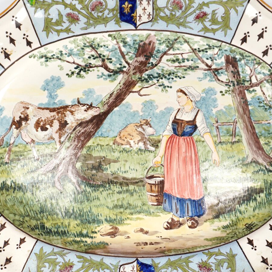 Géo MARTEL à DESVRES : Plat en faïence émaillée polychrome à décor dans le bassin d'une paysanne au bétail, signé dessous, L. 46 cm.