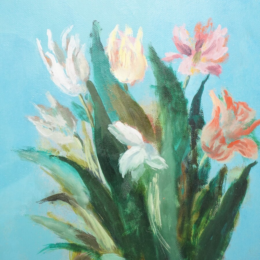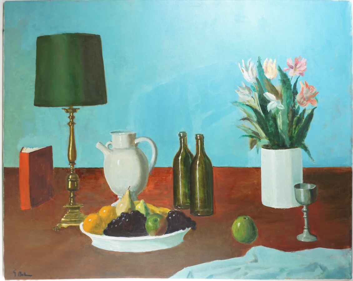 Georges BELLEC (1918-2012), "Nature morte au bouquet et à la lampe", huile sur toile signée en bas à gauche, 93 x 76 cm (non encadrée).