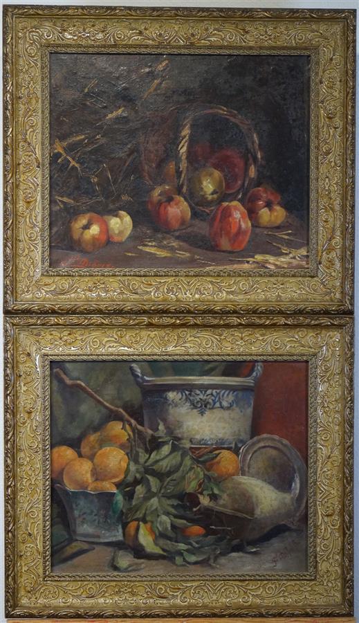 Georges DEBUCHE (XIX-XXe), "Nature morte aux oranges" 1901 & "Nature morte aux pommes" 1901, deux huiles sur toile formant un pendant, signées et datées, 38.5 x 46 cm