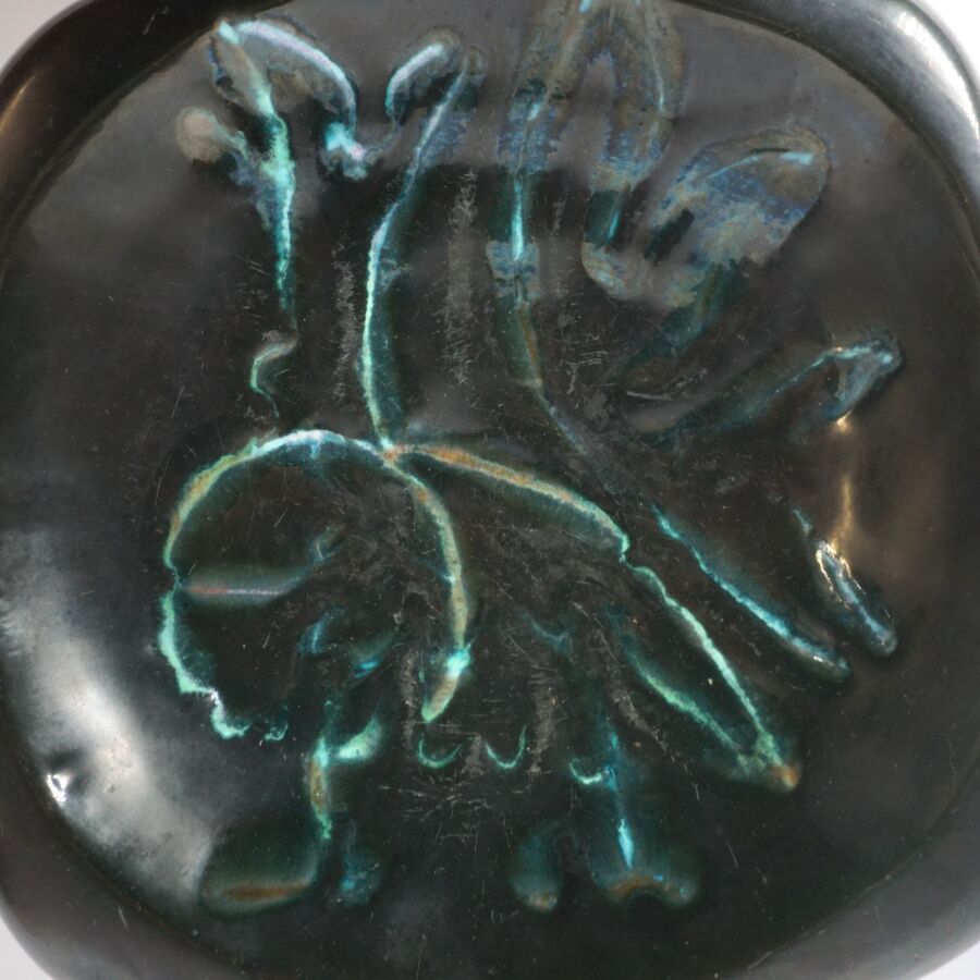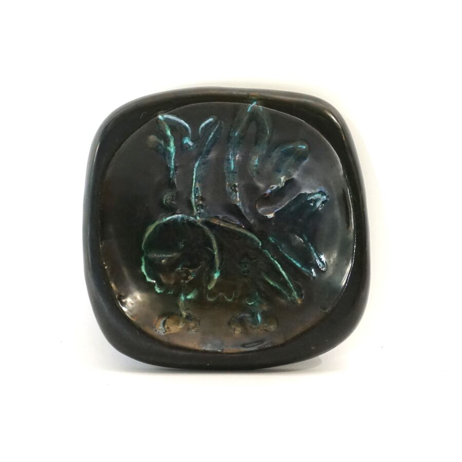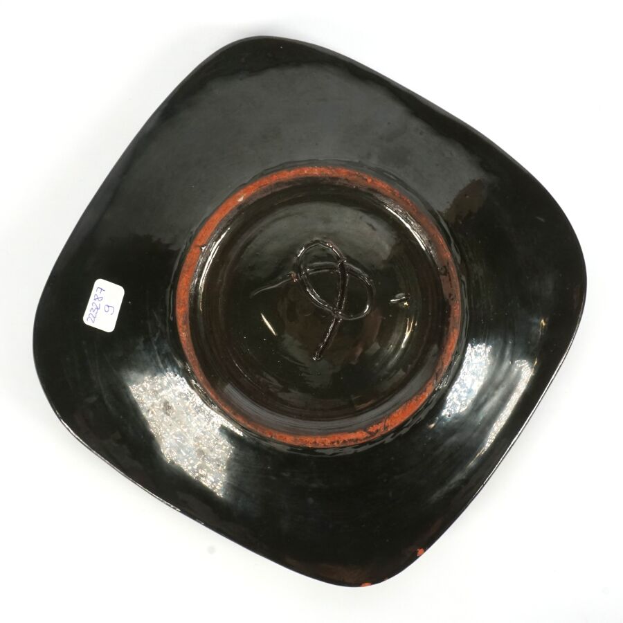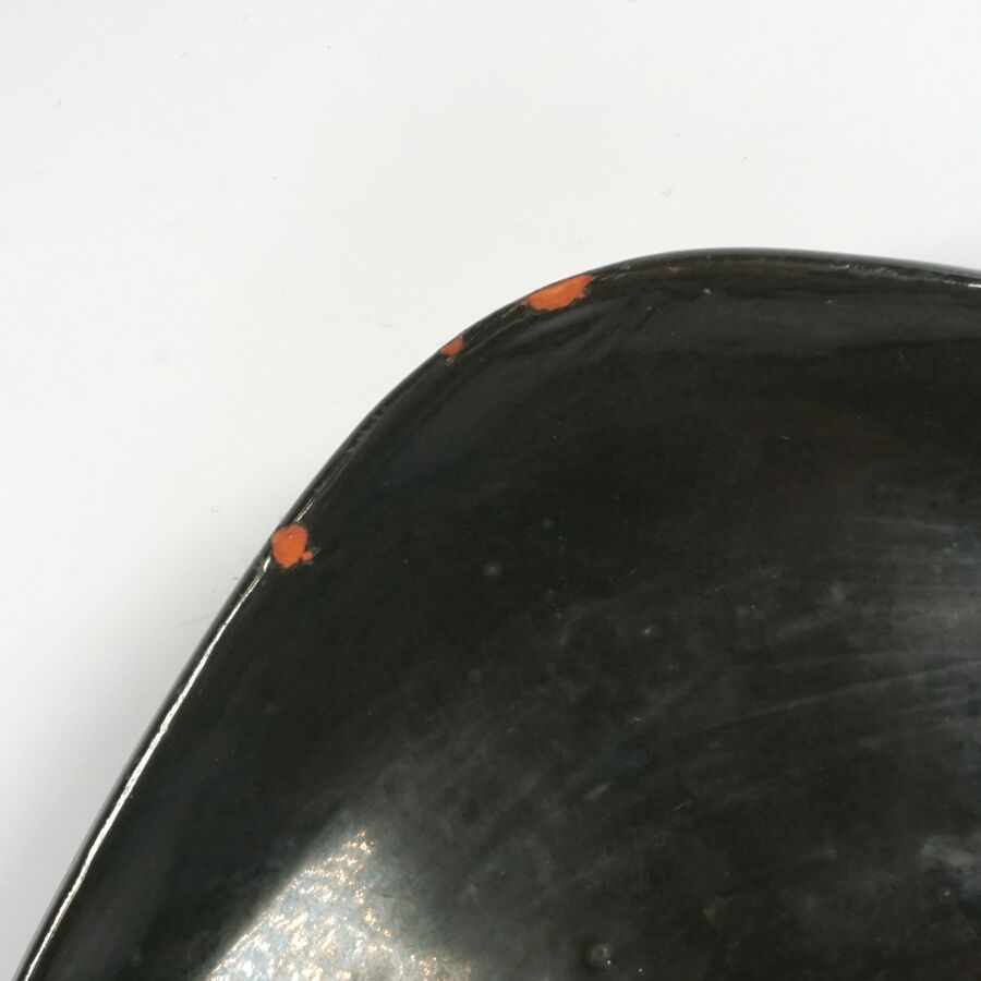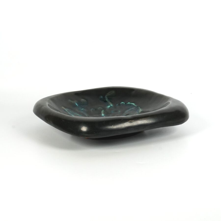 Georges JOUVE (1910 - 1964), Vide - poche en céramique émaillée noire à décor en bleu dans le bassin, marquée au revers, Dim. (deux légers éclats).