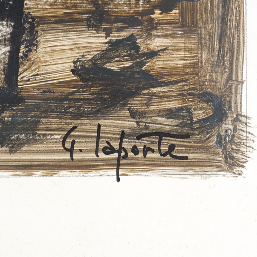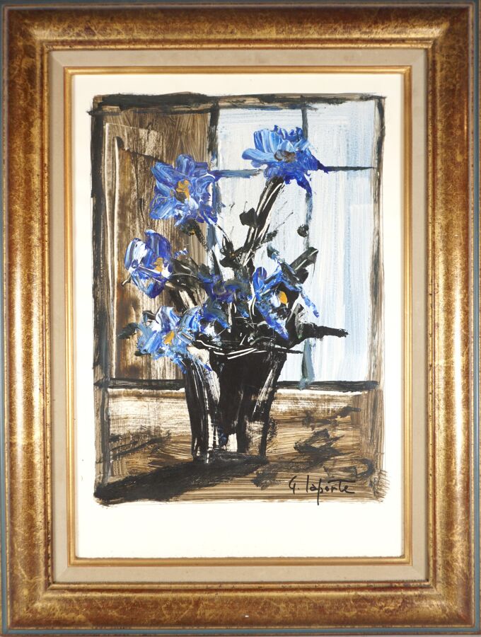 Georges LAPORTE (1926-2000), "Bouquet de fleurs bleues", gouache sur papier, signée en bas à droite, 53 x 36 cm.