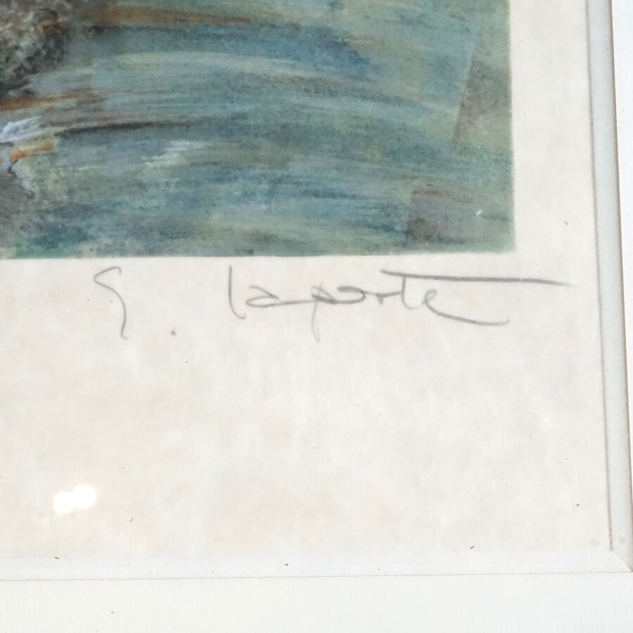 Georges LAPORTE (1926-2000), "Maisons aux toits bleus", lithographie en couleur sur papier Japon justifiée 11/125 en bas à gauche et signée au crayon dans la marge en bas à droite, 68 x 52 cm (à vue).