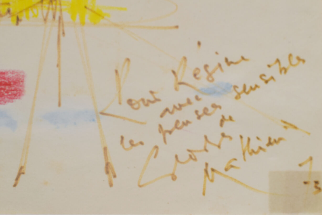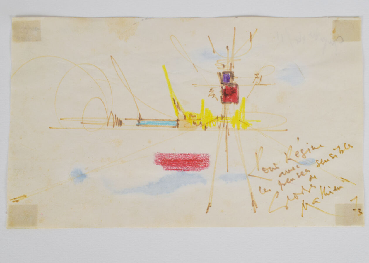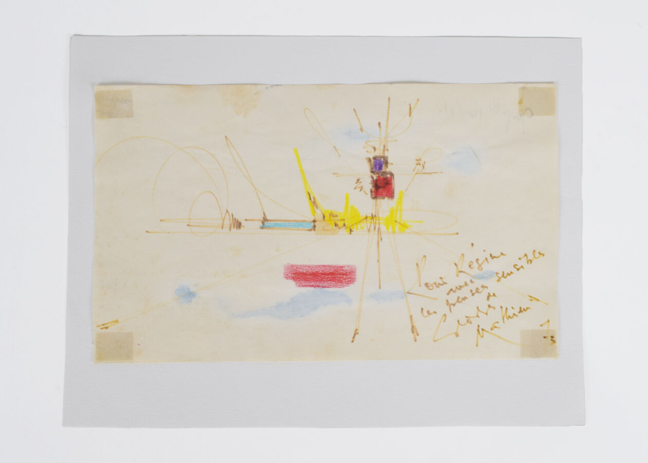 Georges MATHIEU (1921-1912), "Composition", dessin au crayon, feutre et pastel sur papier, signé et dédicacé en bas à droite, 12 x 20 cm.