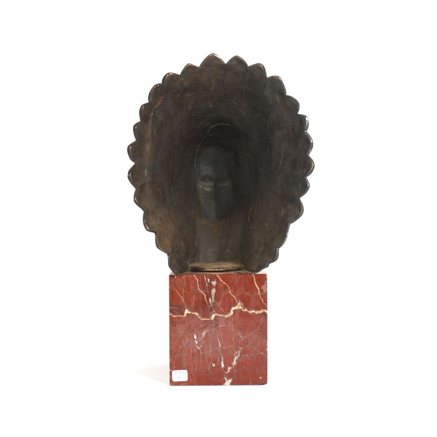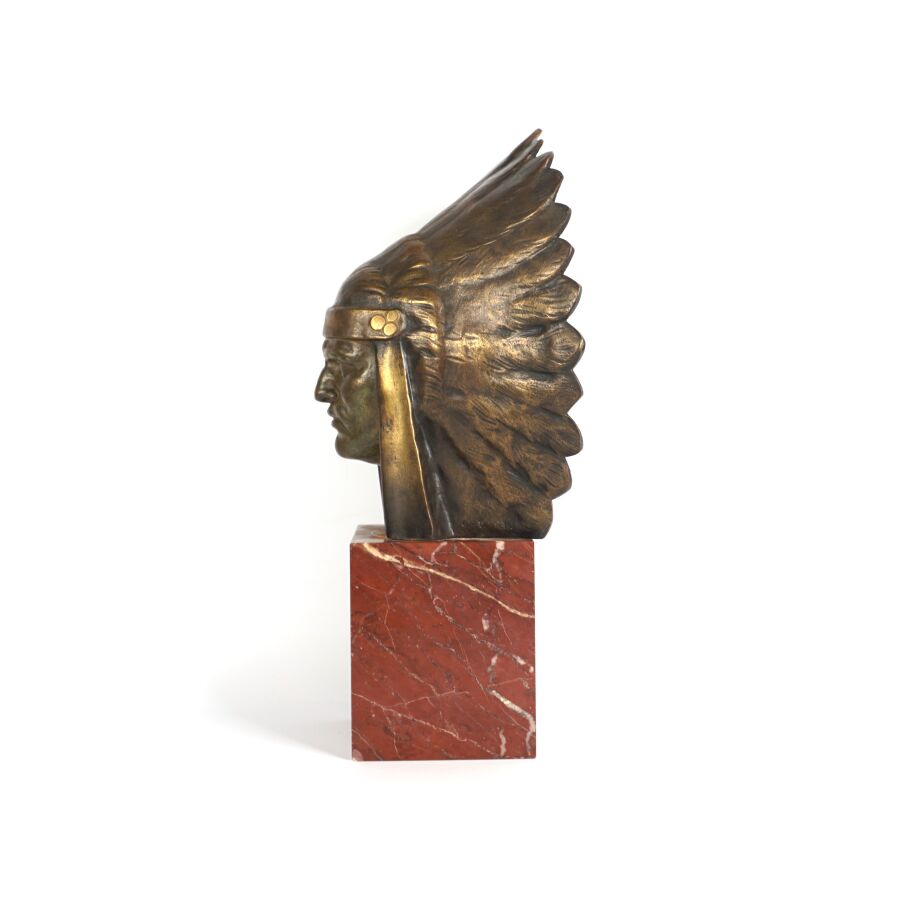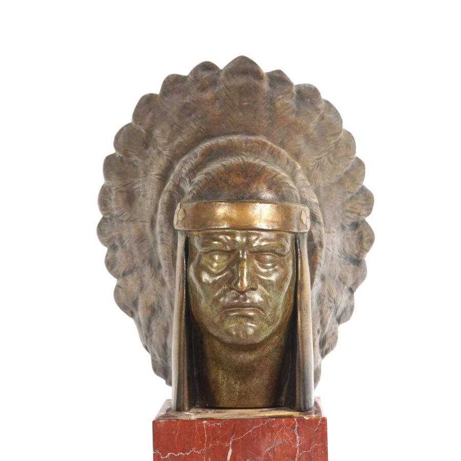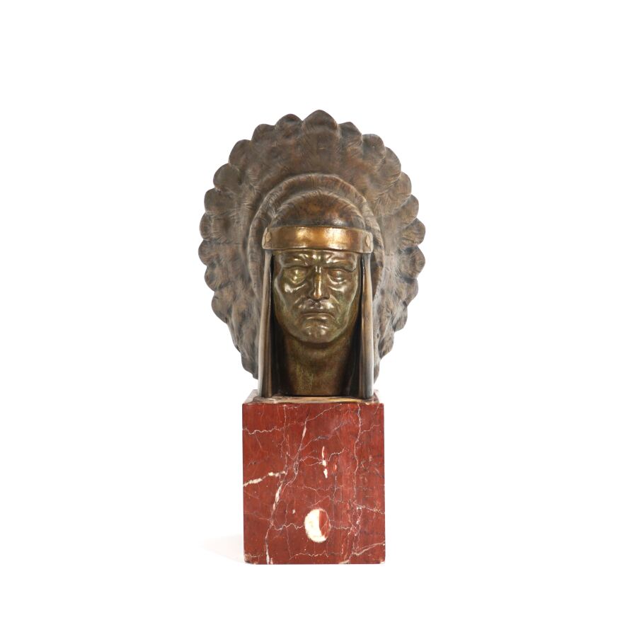 Georges Raoul GARREAU (1885), "Chef indien", sculpture en bronze à patine brune, signé en creux sur le côté, présenté sur un socle quadrangulaire en marbre rouge veiné blanc, H. 47 cm (petites égrenures).