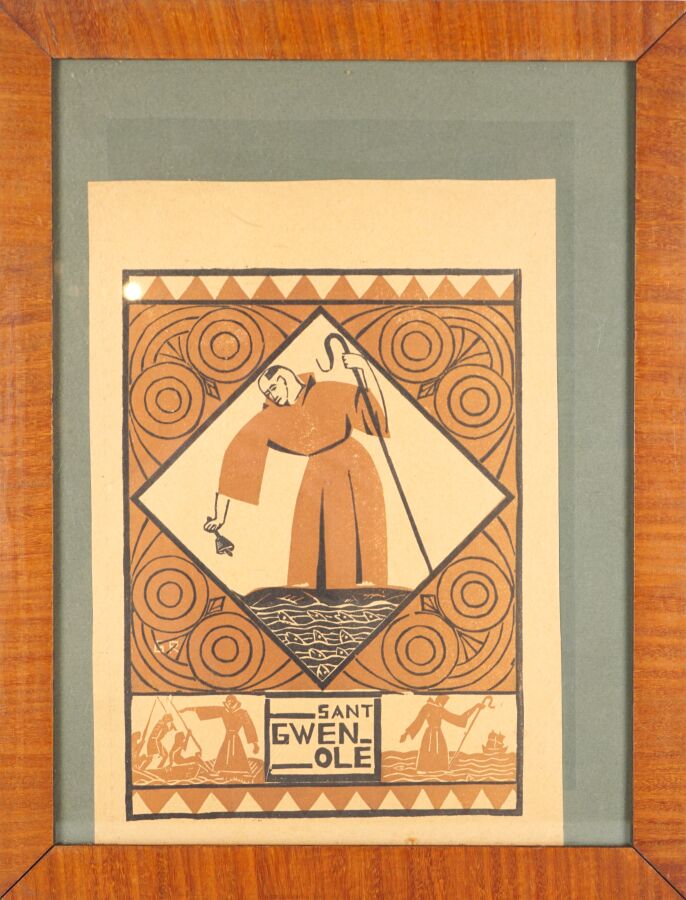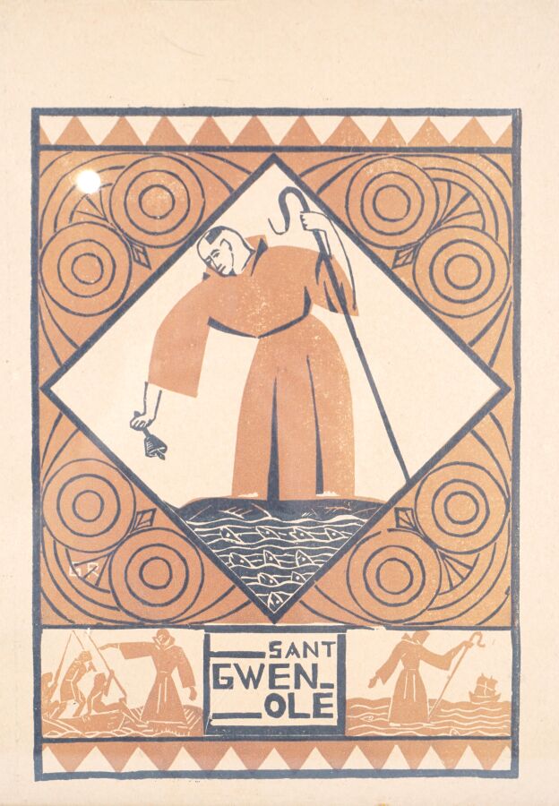 Georges ROBIN (1904-1928), "Saint Gwenolé et les poissons", linogravure monogrammée en bas à gauche dans la planche, 28.5 x 20 cm.
