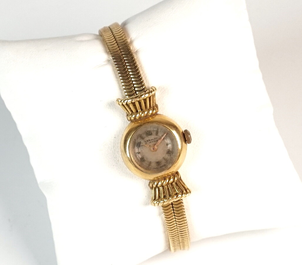 GERALDY : Montre de dame en or jaune 18 K (750/oo) boitier circulaire chiffres arabes, épaulé de 2 motifs de panier ajouré, bracelet double maille serpent, fermoir à cliquet (à refixer), L. 16 à 16.5 cm. Poids brut : 28.6 g environ.