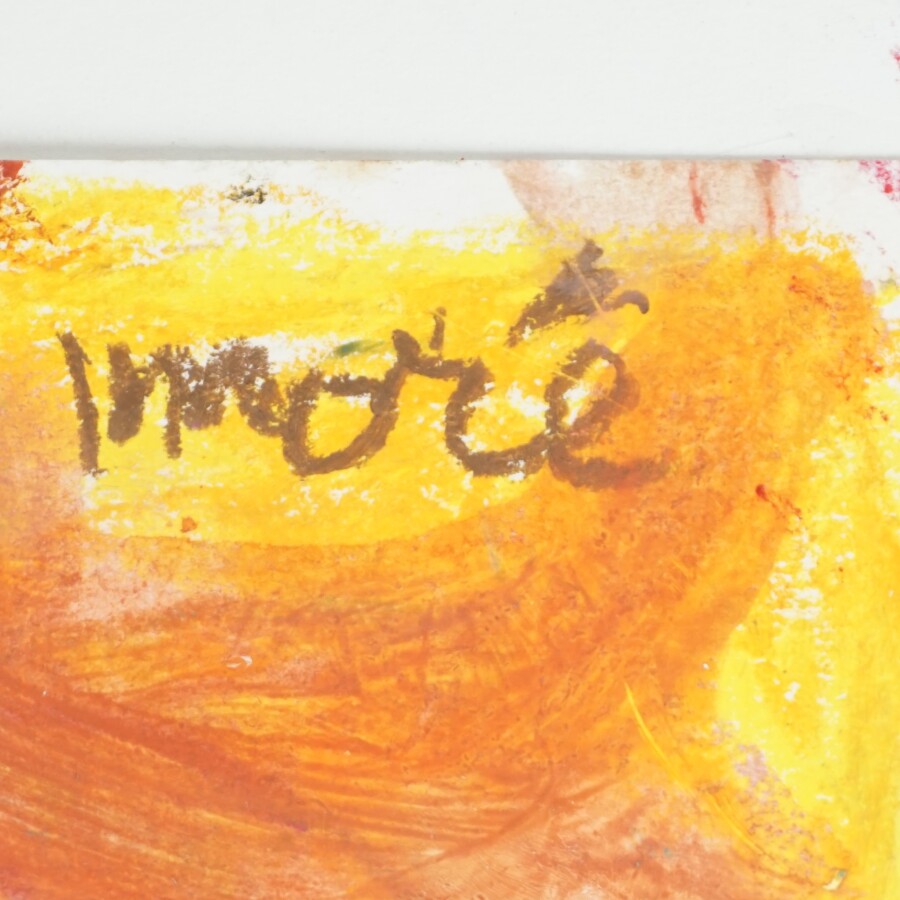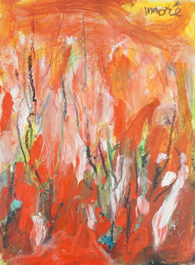 Germaine MORE (1903), "Incendie en forêt", gouache sur papier signée en haut à droite et titrée au dos, 24 x 32 cm.