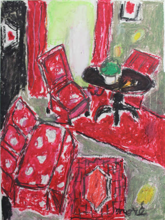 Germaine MORE (1903), "Intérieur rouge", pastel et gouache sur papier, signé en bas à droite, 24 x 32 cm (Provenance : Fonds d'atelier Germaine Moré)