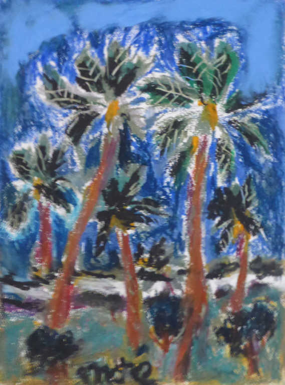 Germaine MORE (1903), "Palmiers", pastel et gouache sur papier, signé en bas au centre, 24 x 32 cm (Provenance : Fonds d'atelier Germaine Moré)