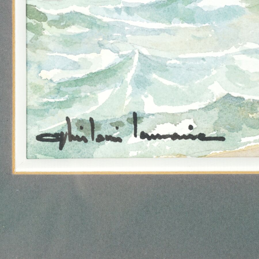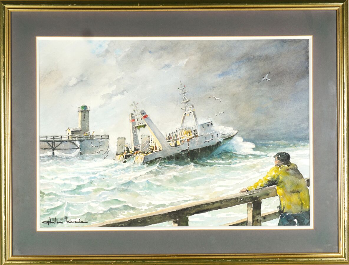 Ghislain LEMAIRE (1933-2012), "Chalutier sortant du port de Fécamp par gros temps", aquarelle sur papier signée en bas à gauche, 34 x 49 cm (à vue).