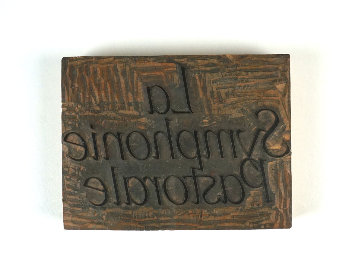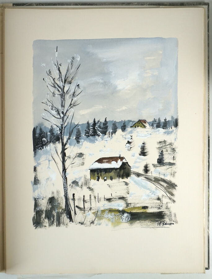 GIDE (André) - La symphonie pastorale - Sans lieu ; Robert Léger Éditeur, [1962], impression par Dominique Viglino - 1 volume In-folio en feuilles sous couverture rempliée, chemise ornée en noir et blanc, titrée or au dos et emboîtage à l'identique - 25 aquarelles peintes sur chaque exemplaire et signées par Jean-Pierre Rémon dont 3 sur double page, 7 à pleine page, 13 in texte et 3 culs-de-lampe - Très bon exemplaire de collaborateur (chiffré D sur les 10, tirage total : 170 + 10 hors commerce) - On y joint : la plaque de bois de l'imprimeur ayant été utilisée pour le titre.