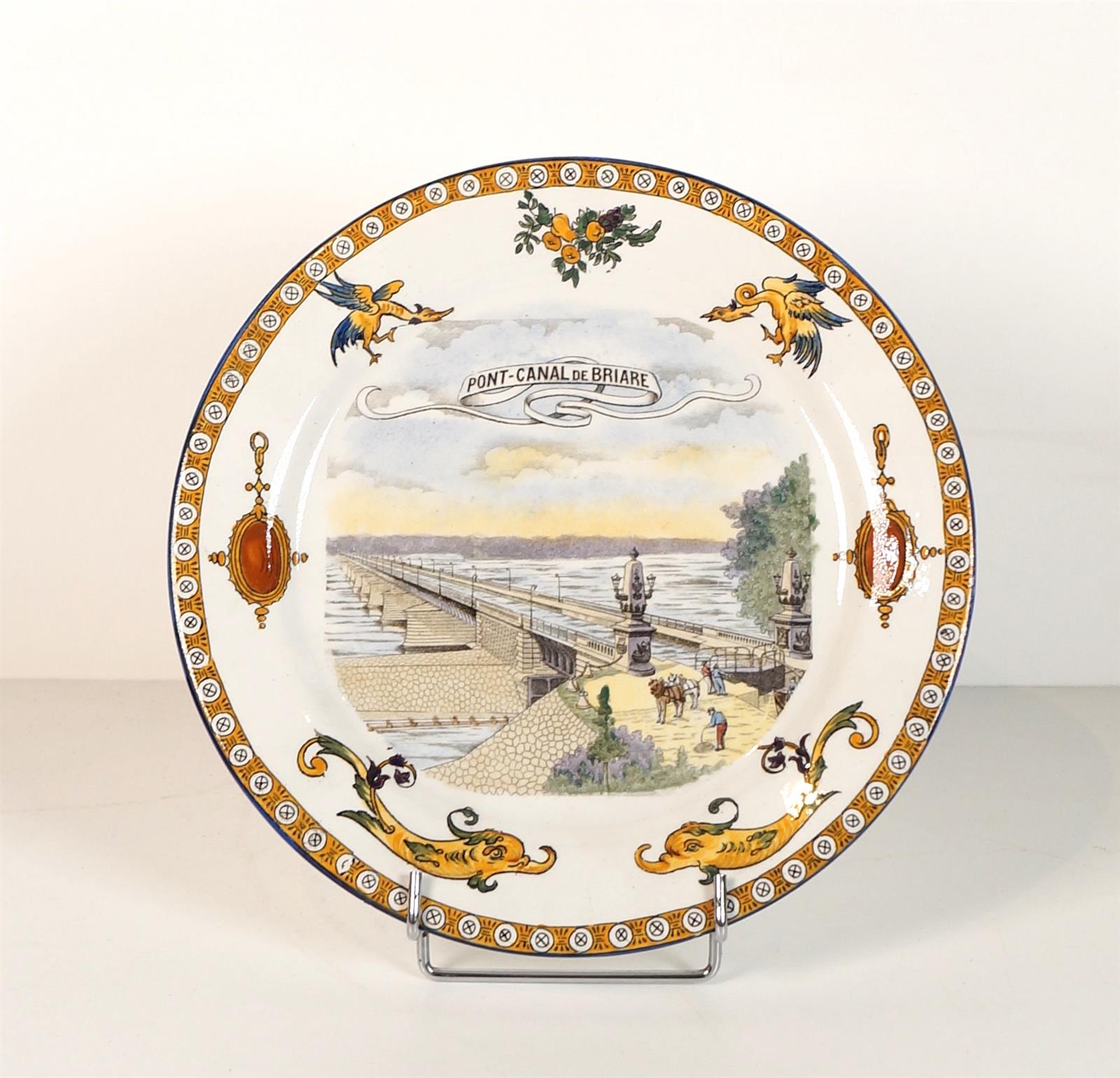GIEN : Assiette en faïence fine à décor polychrome, titrée "Pont-Canal de Briard" (Bourgogne), fin 19e siècle, D. 24.8 cm.