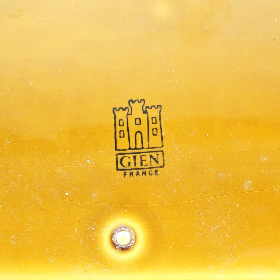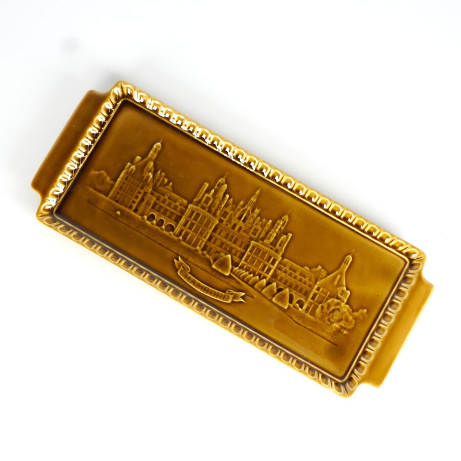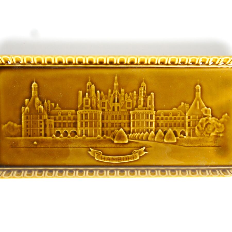 GIEN : "Chambord", plat à cake en faïence émaillée monochrome à décor dans le bassin du Château de Chambord, signé dessous, 34 x 14 cm.