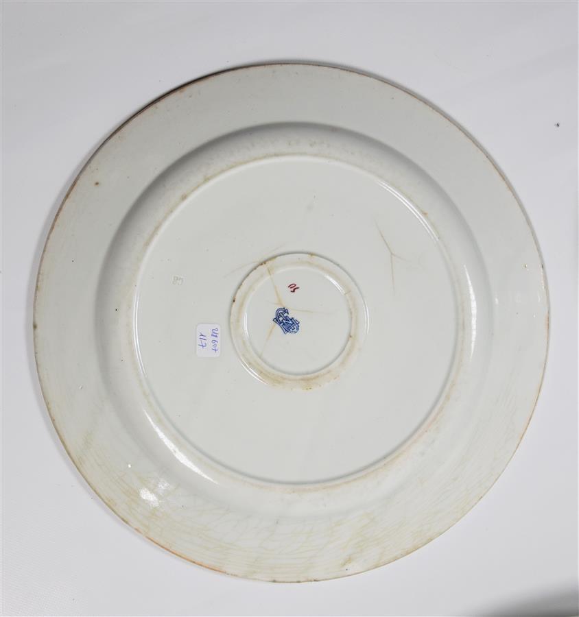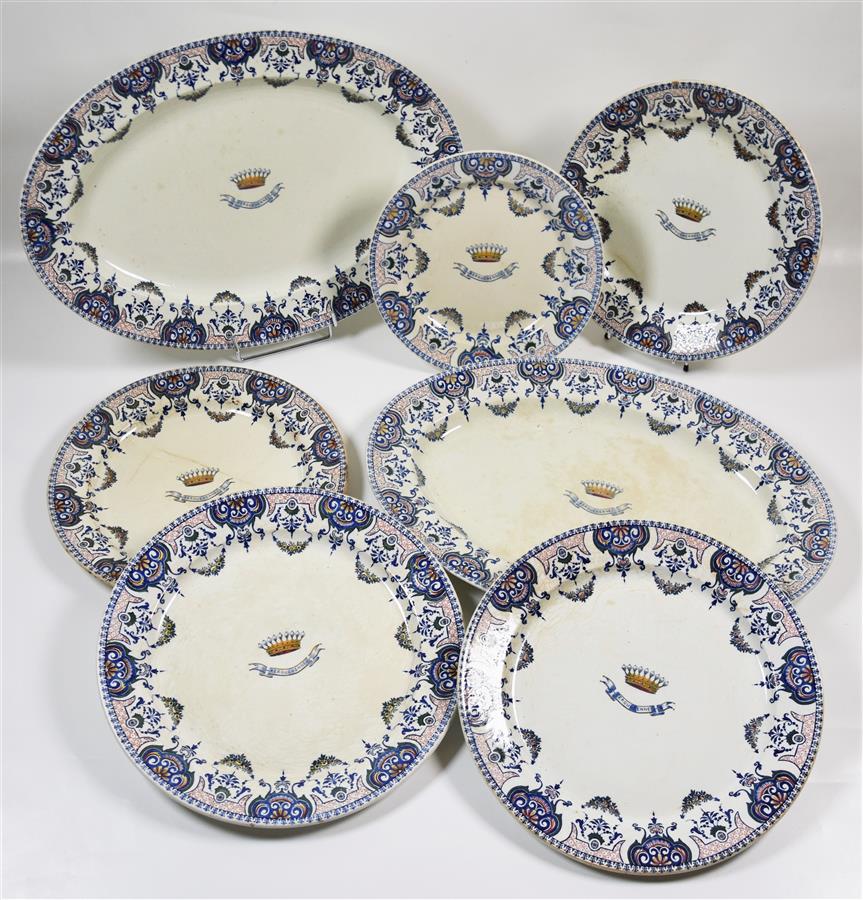 GIEN : Ensemble de 7 plats circulaires et ovales en faïence polychrome, à décor de lambrequins dans le goût de Rouen, présentant au centre un étendard "Kerguehennec" sommé d'une couronne comtale, L. de 27.5 à 53 cm (deux plats accidentés, usures au décor et traces jaunes par endroits)
