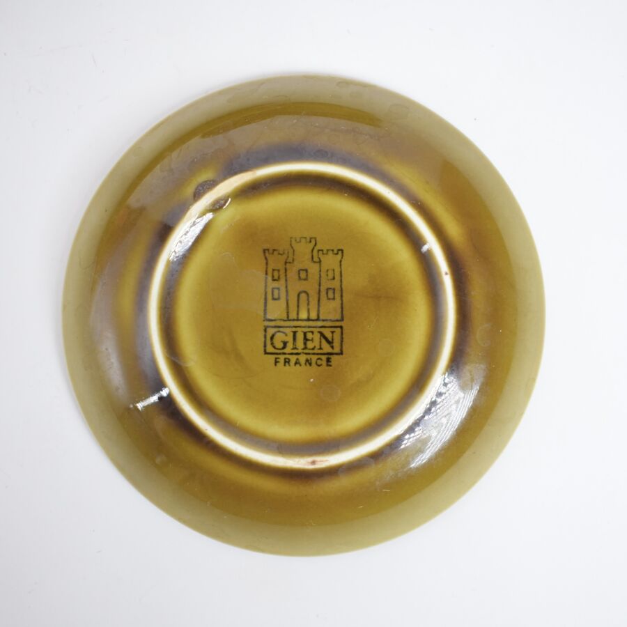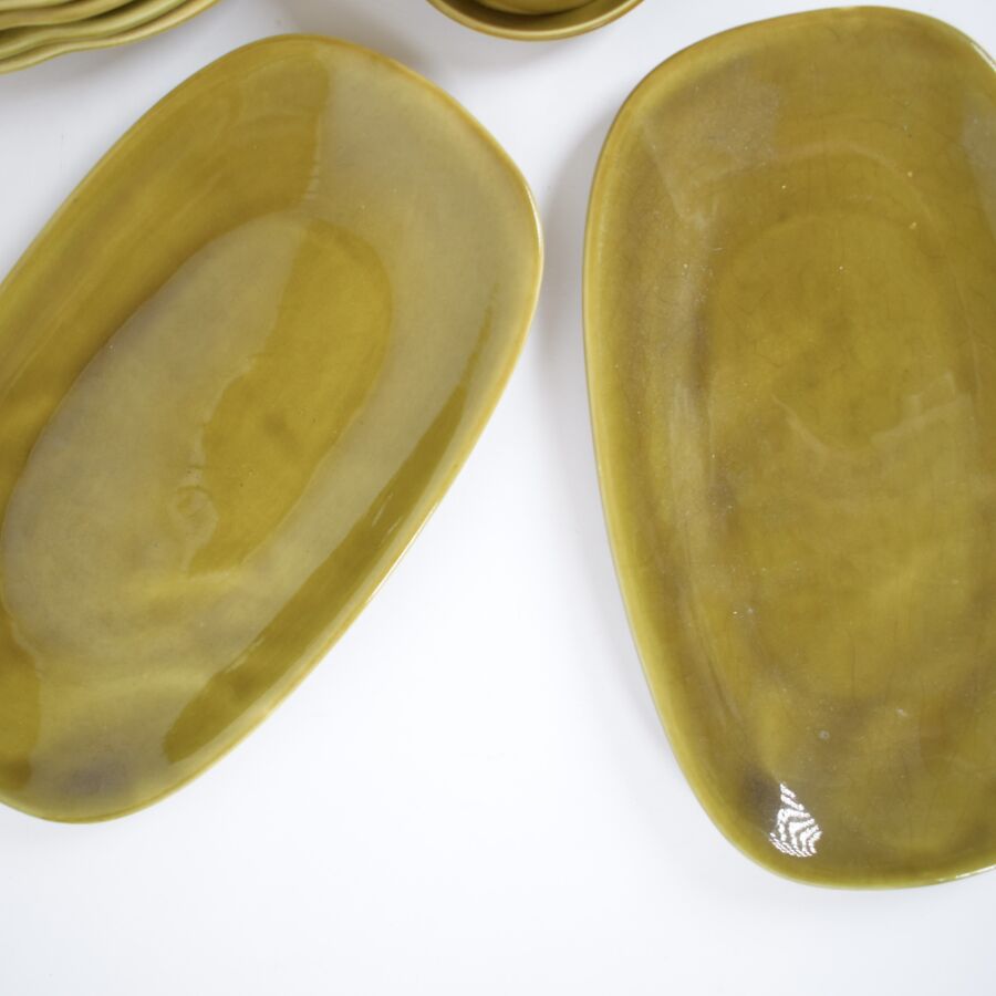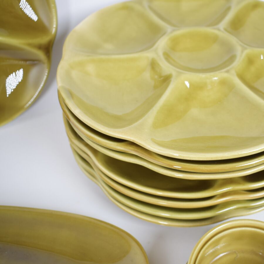 GIEN : Service à huîtres en faïence émaillée vert olive comprenant 8 grandes assiettes, 2 petites assiettes, 2 plat, 1 petite coupelle.