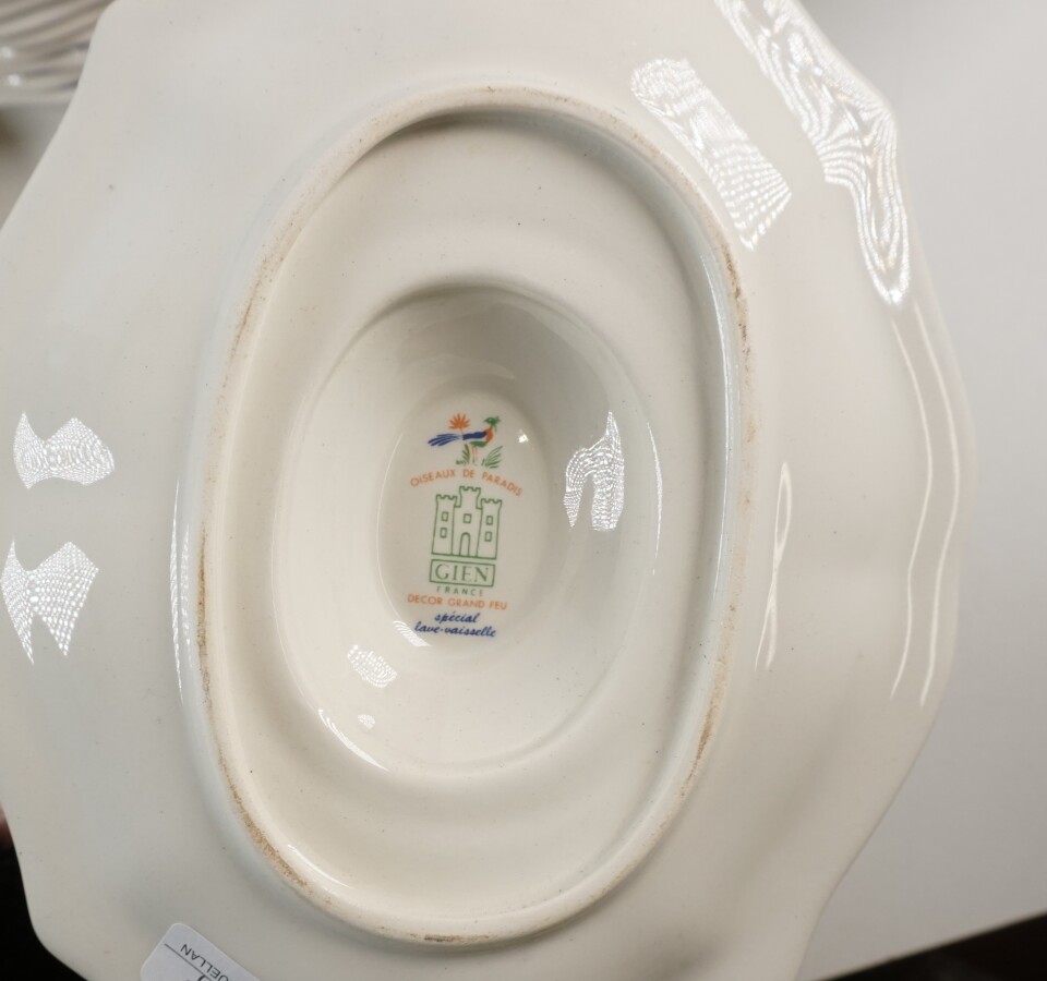 GIEN : Service en faïence émaillée polychrome à décor d'oiseaux du paradis, comprenant : 1 soupière, 1 saucière, 1 plat oval, 9 assiettes à dessert, 14 assiettes plates, 2 petits plats ronds, 12 assiettes creuses, 6 tasses et soucoupes, 1 théière et 1 sucrier, 20e siècle, D. assiette plat : 25 cm, H. soupière 22 cm (fêles, petits éclats).