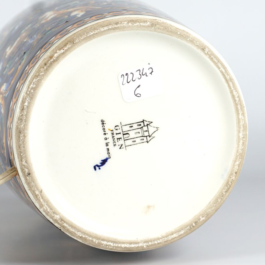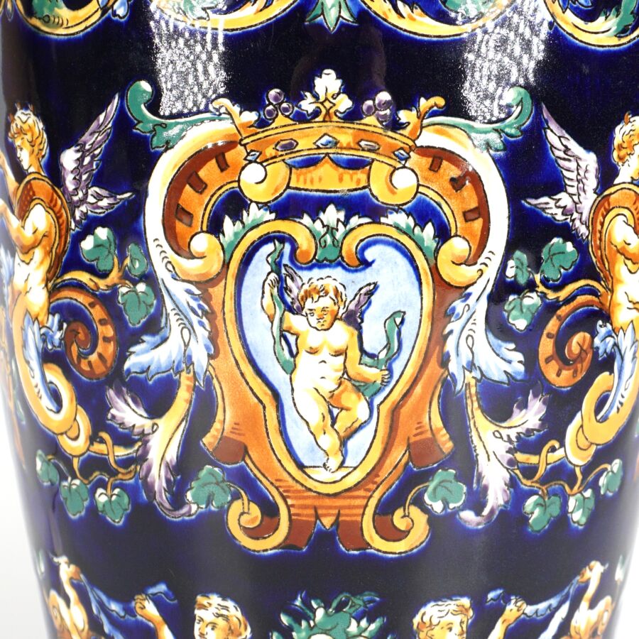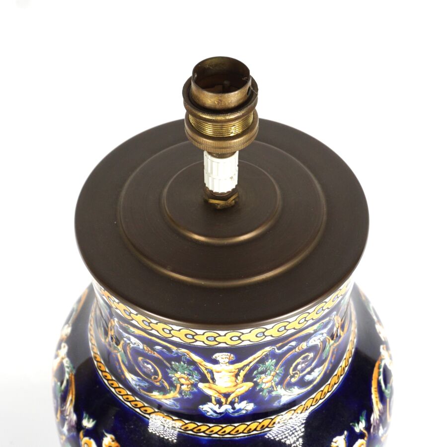 GIEN : Vase en faïence émaillée polychrome à décor de rinceaux et cariatides sur fond bleu Outre-mer, monté en lampe, marqué sous la base, H. 36 cm.