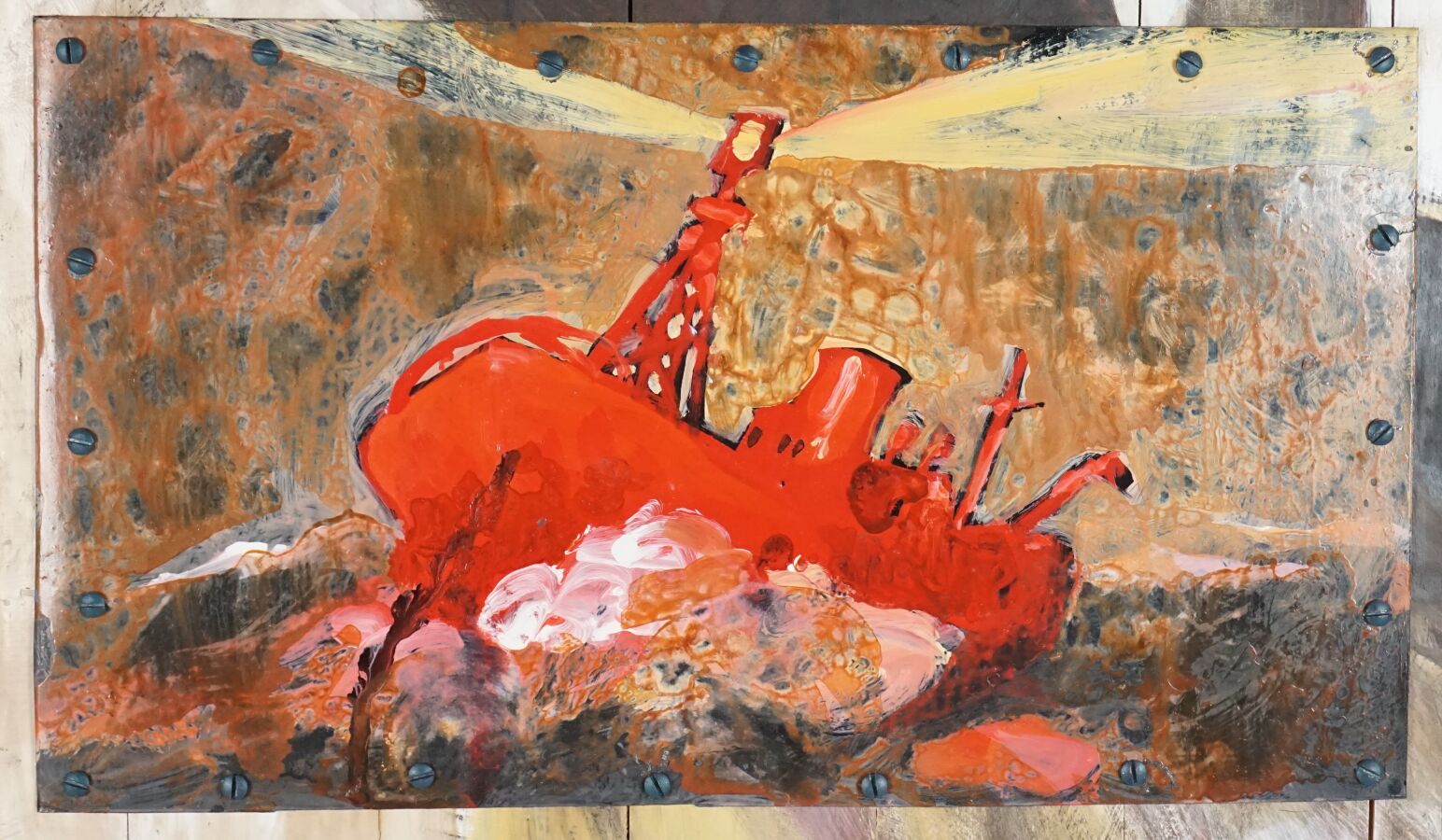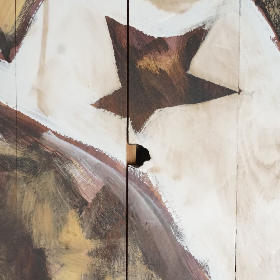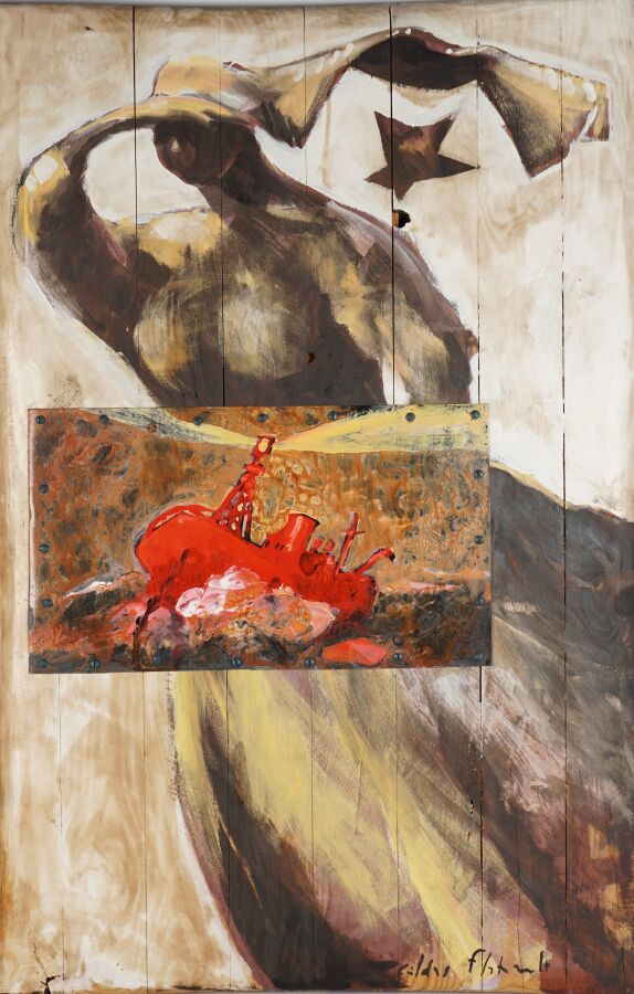 Gildas FLAHAULT DE CROZET (1957), "L'attente", technique mixte sur panneau formé de planches, signée en bas à droite, 55 x 83,5 cm.