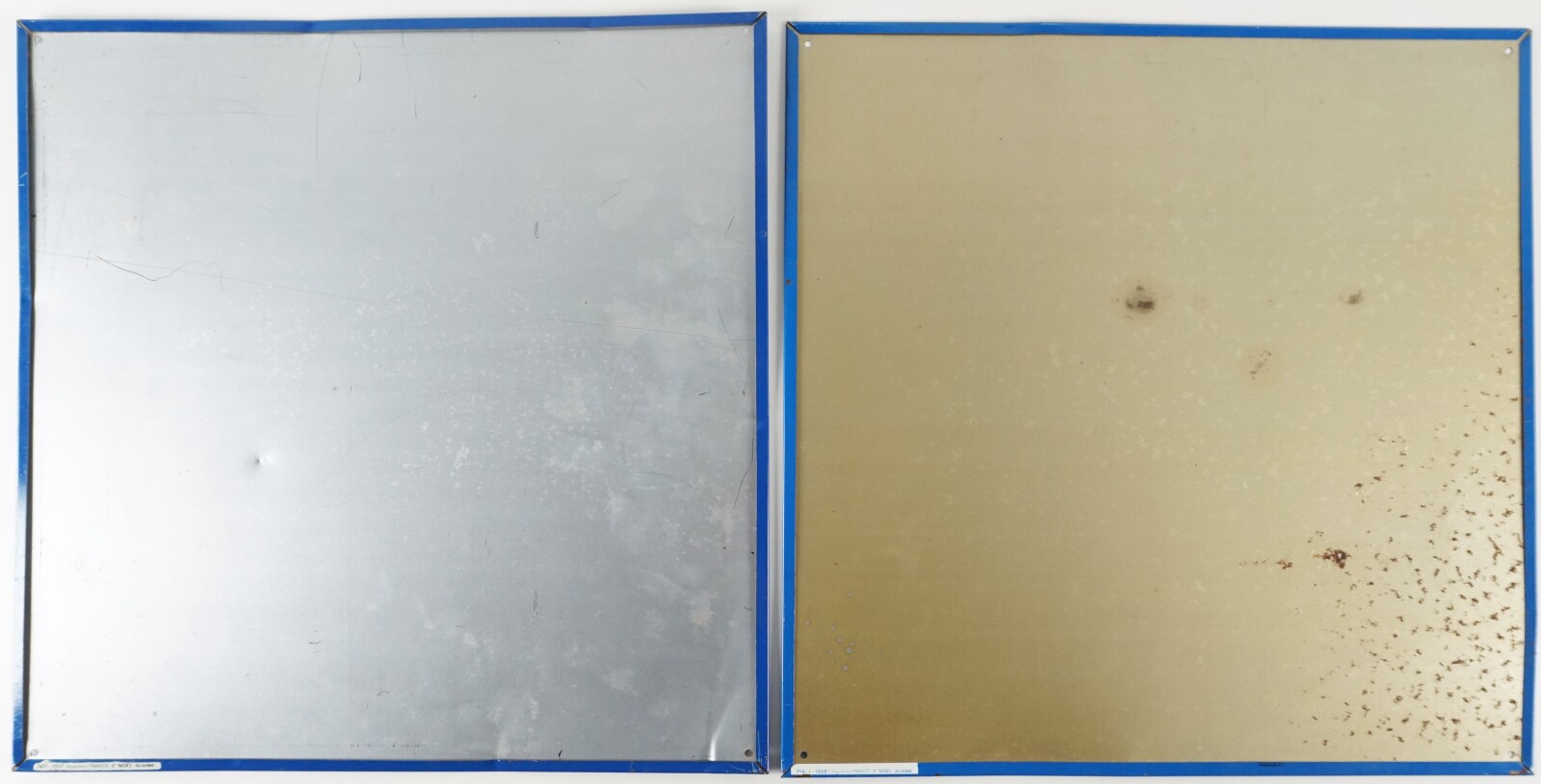 GILLETTE : Deux plaques en tôle fine émaillée, "Gillette, super rapide" et "Gillette", imprimerie France, Auxerre, 1957 et 1958, réédition, à 4 trous de fixation,