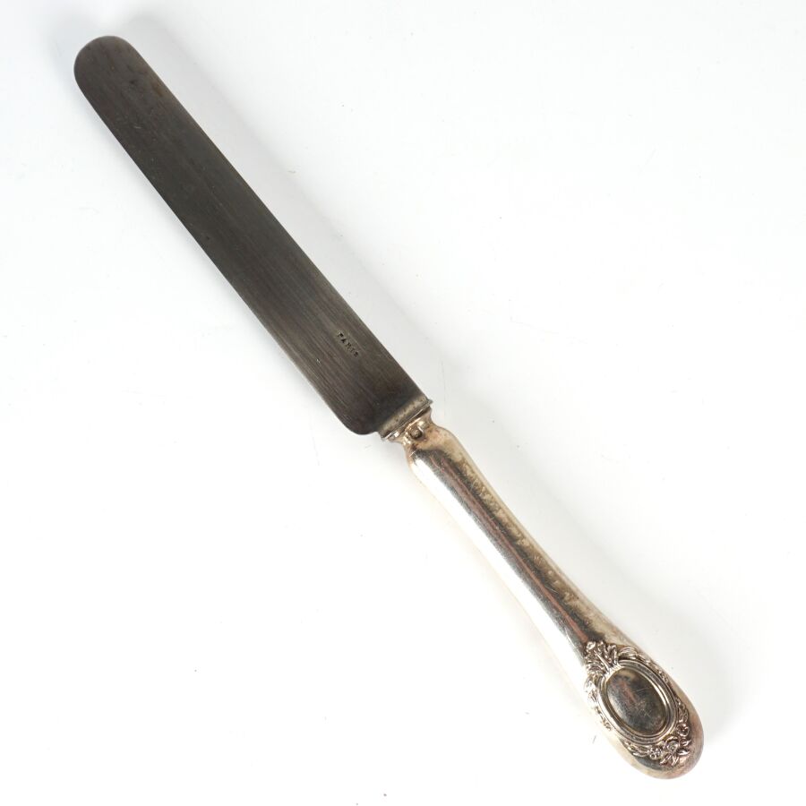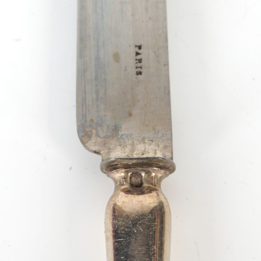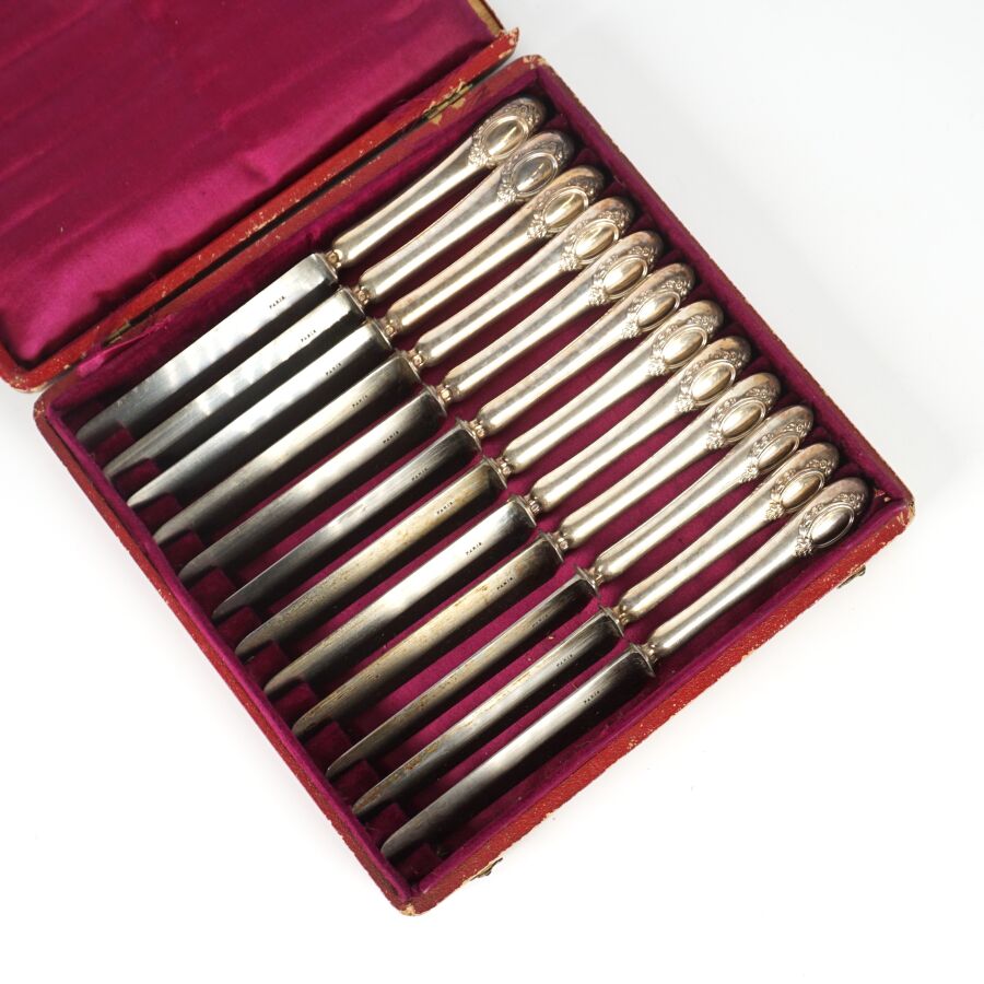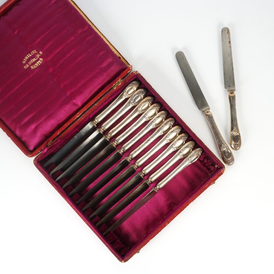 GIMILINI - NANTES : Suite de 12 couteaux, manche en argent fourré, poinçon Minerve 1er titre, lame en acier, présentée dans leur coffret d'origine, L. 20.5 cm.