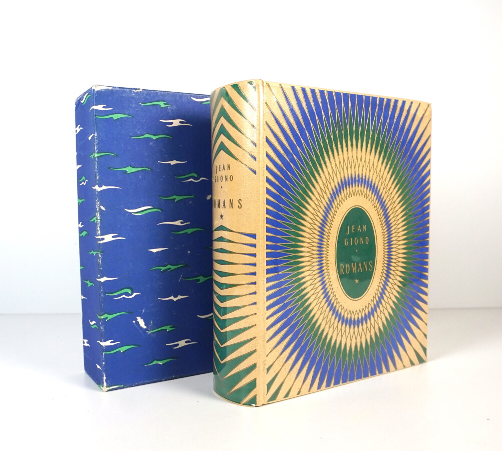 GIONO (Jean) - Romans - Paris ; Gallimard, NRF, 1956 - 1 volume grand In-8° - 32 aquarelles par Cavaillès, H. Erni, Fontanarosa, Guerrier, Élie Lascaux, M. Sarthou, Pierre-Yves Trémois - Reliure cartonnage polychrome éditeur d'après la maquette de Paul Bonet sous rhodoïd (fendu au dos) et emboîtage - Très bon exemplaire numéroté