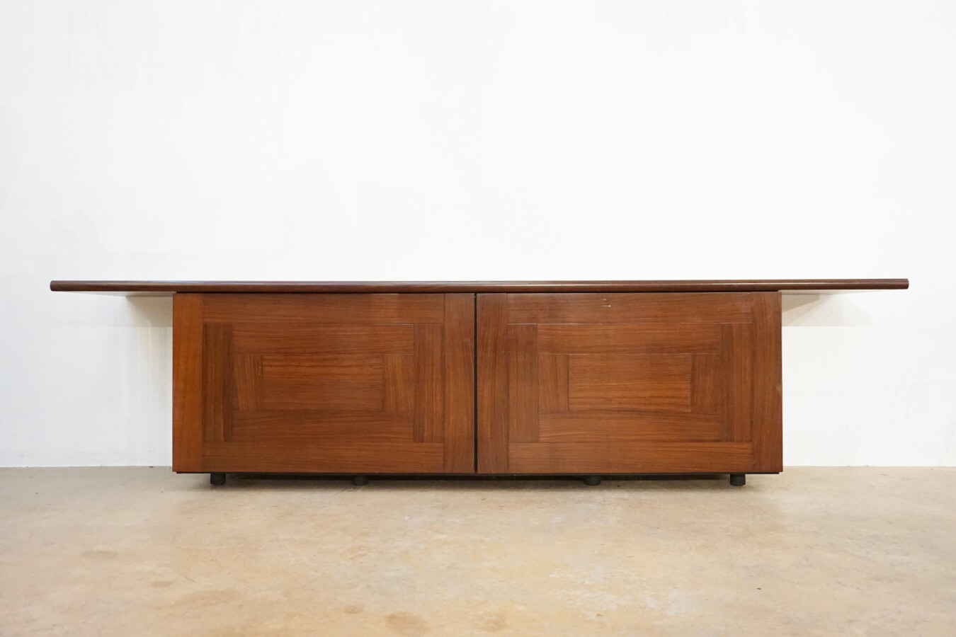 Giotto STOPPINO (1926-2011) & Lodovico ACERBIS (1939) pour ACERBIS : Enfilade design à système, modèle "Sheraton" circa 1970-1980, en bois de placage et aggloméré, ouvrant à 2 volets à décor géométrique, dévoilant au centre 4 tiroirs et un casier à une étagère en verre, les mêmes volets présentant un système pivotant ouvrant en vantail pour découvrir aux extrémités un nouveau casier agrémenté d'un plateau en verre, l'ensemble est coiffé d'un large plateau, 280 x 48.5 x H. 71 cm (quelques marques, une extrémité du plateau légèrement insolée).