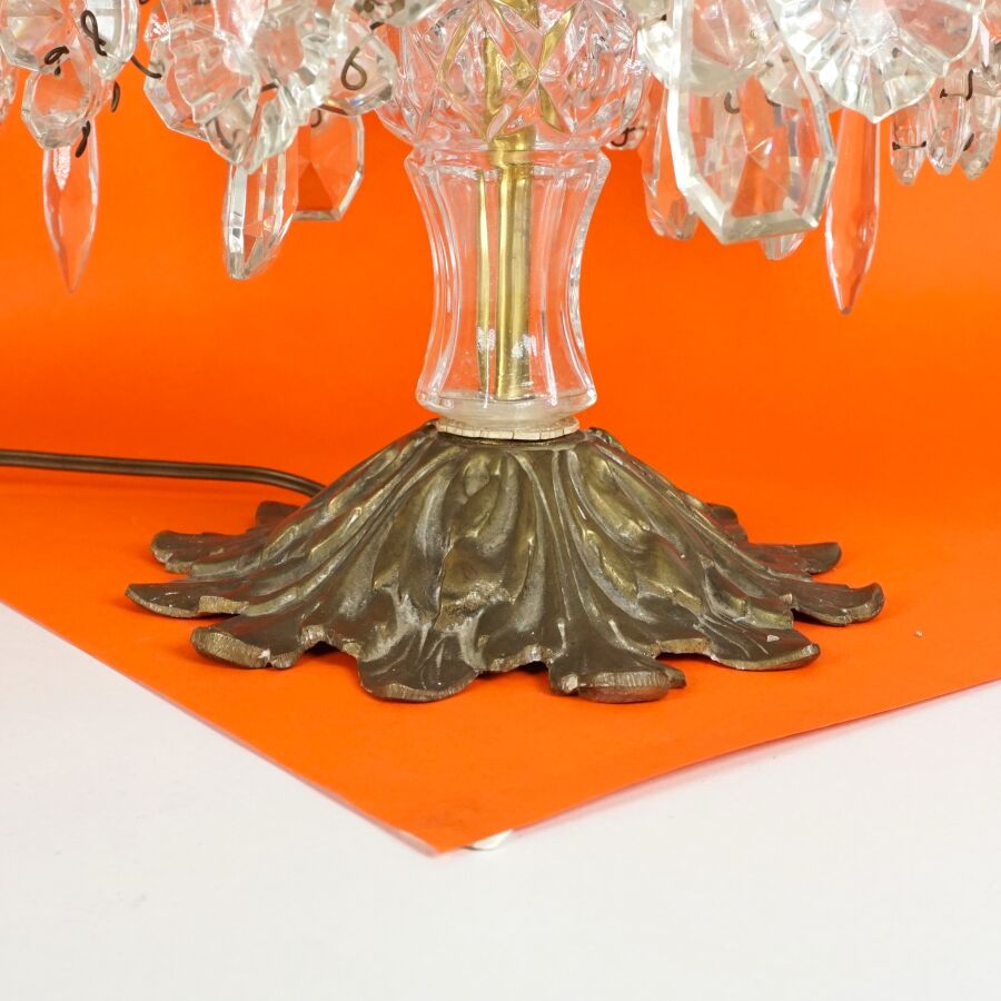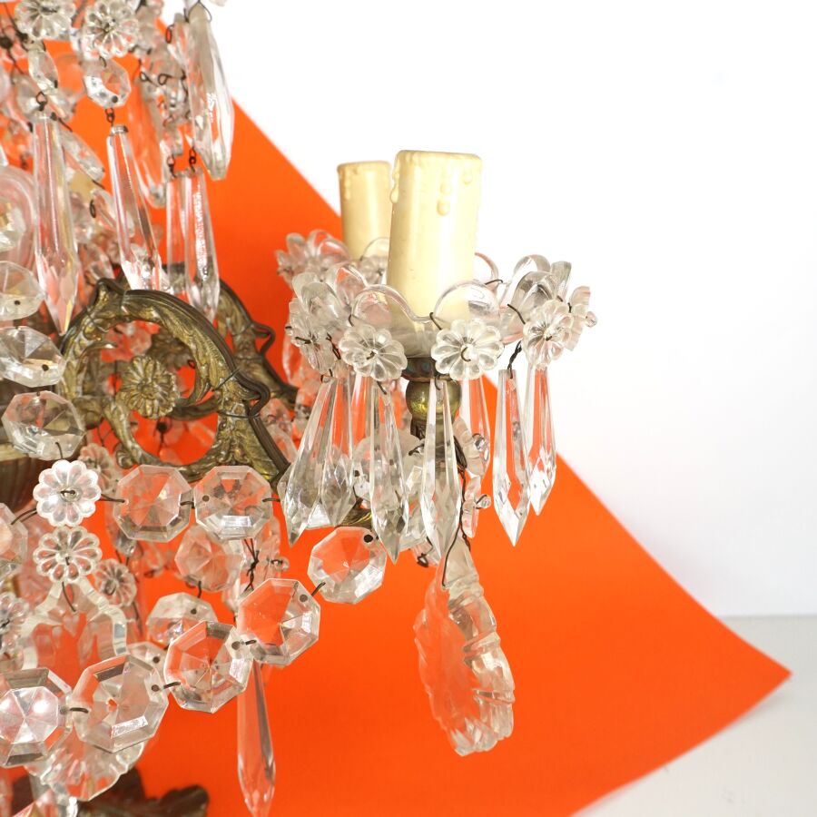 Girandole à six bras de lumières, structure en métal et laiton doré ornée de pampilles et pendeloques en verre, circa 1880, H. 60 cm (accidents).