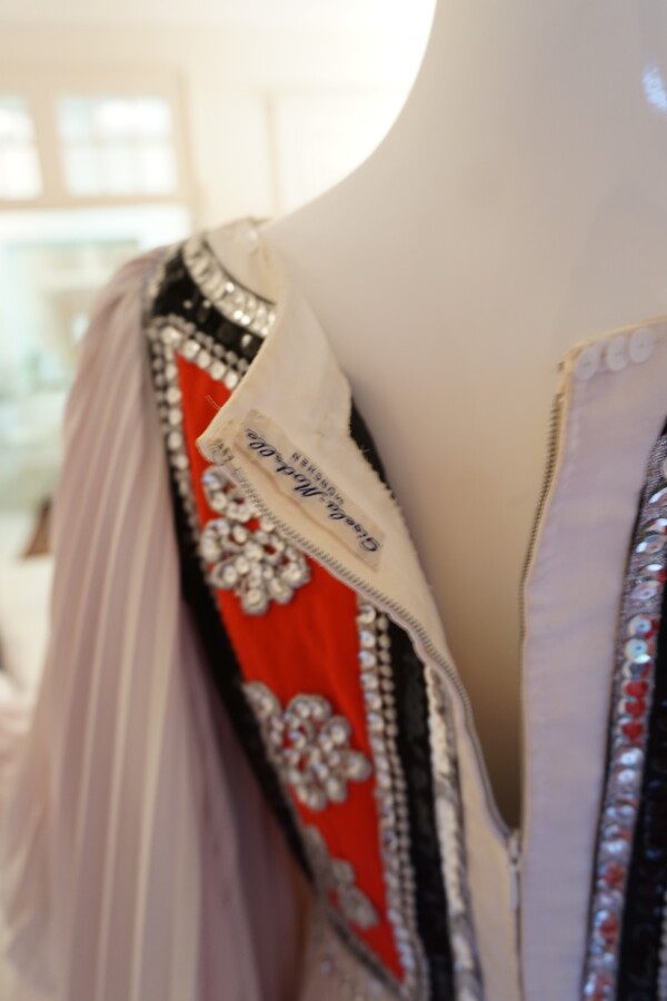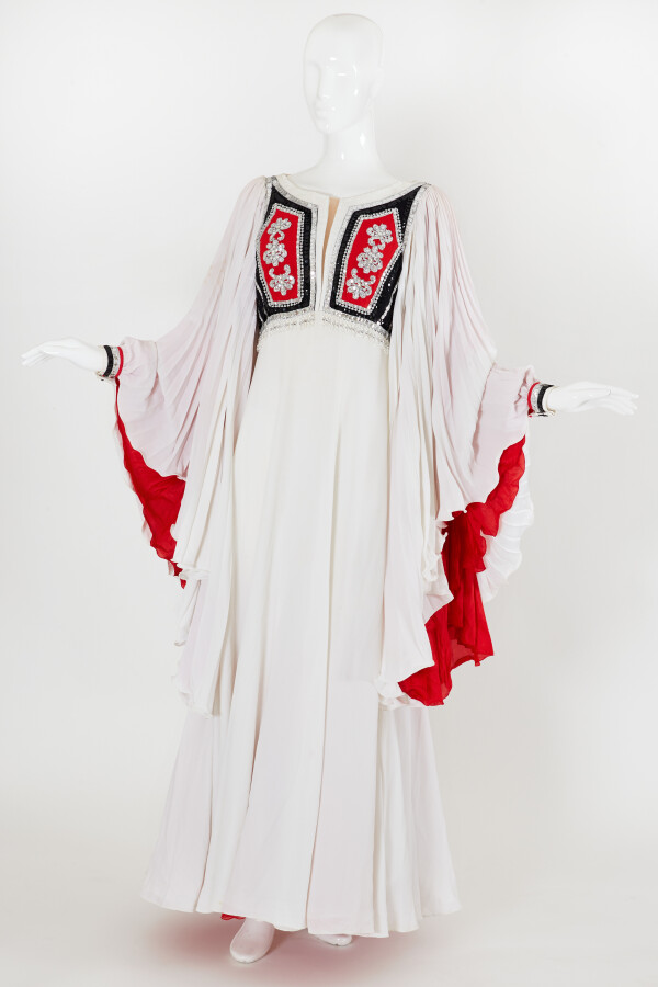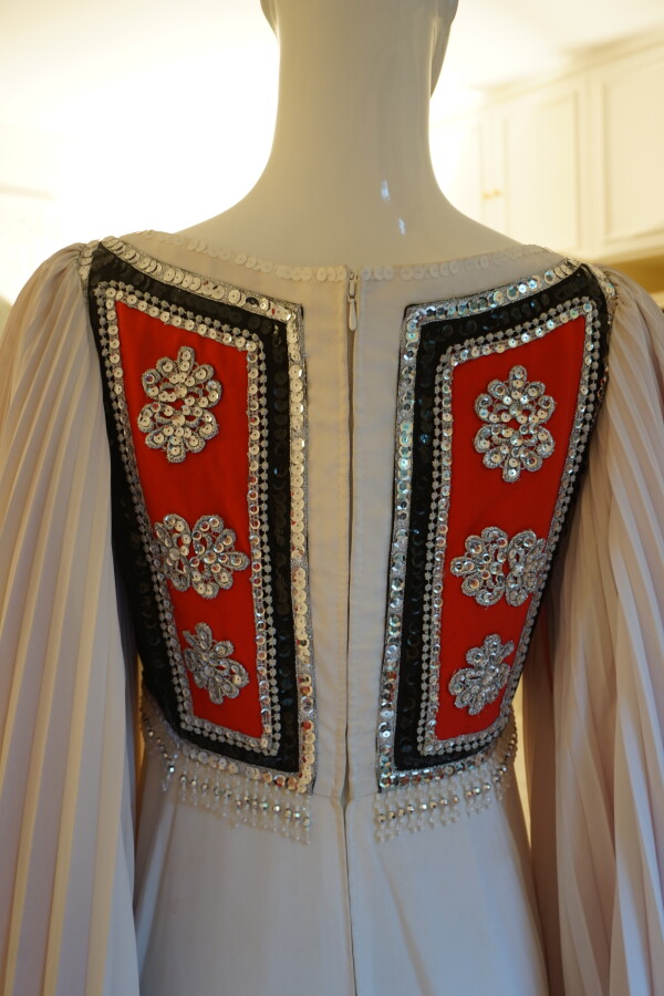 Robe longue blanche en crêpe, de style grec, corsage brodé de grosses paillettes rouges, noires et argentées, orné de pendants de perles transparentes, grandes manches plissées intérieur rouge, resserrés par 2 boutons pression.