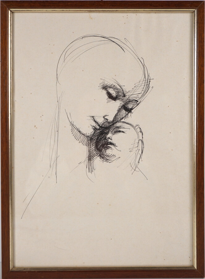 Giulio CARMINATI (1925-1978), "Vierge à l'enfant" Treviglio (Bergame) Italie, deux dessins à l'encre formant un pendant, non signés, annotées et situées au dos, 34 x 24.5 cm (quelques rousseurs).