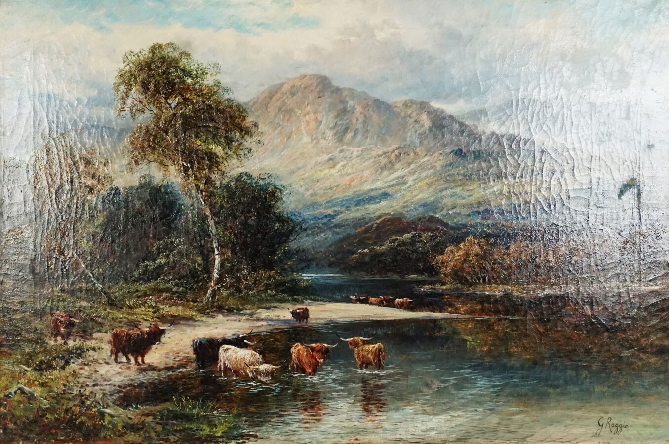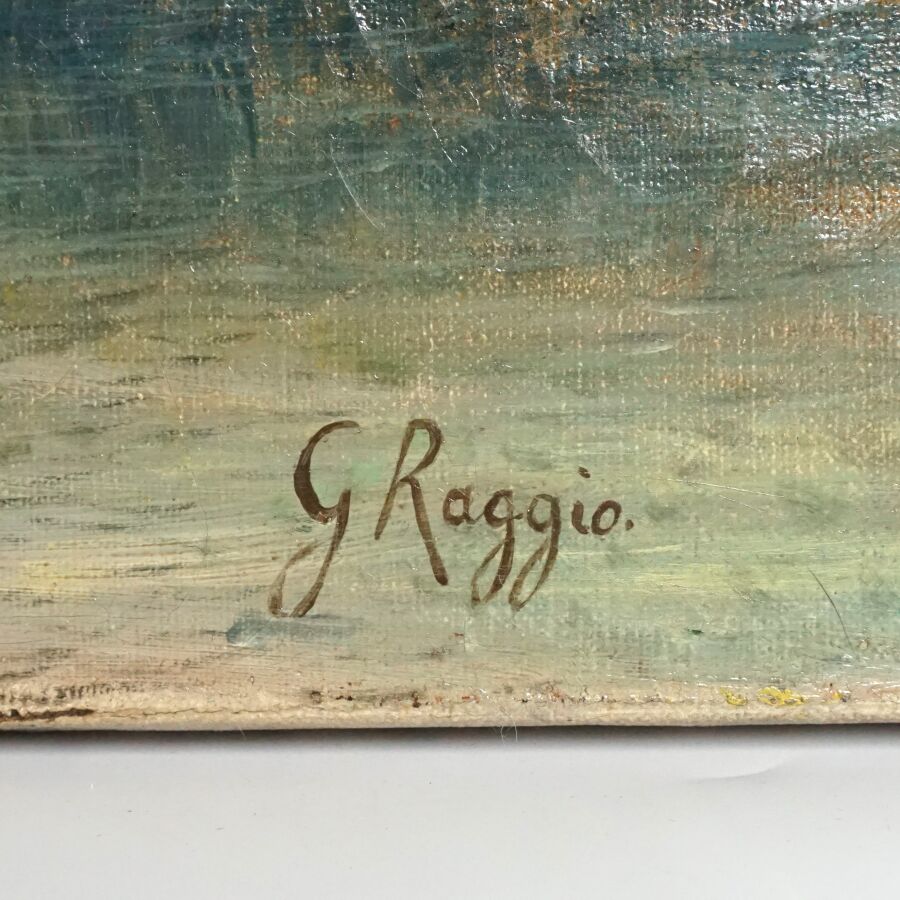 Giuseppe RAGGIO (XXe), ''Le troupeau", huile sur toile signée en bas à droite, 76 x 51 cm (craquelures).
